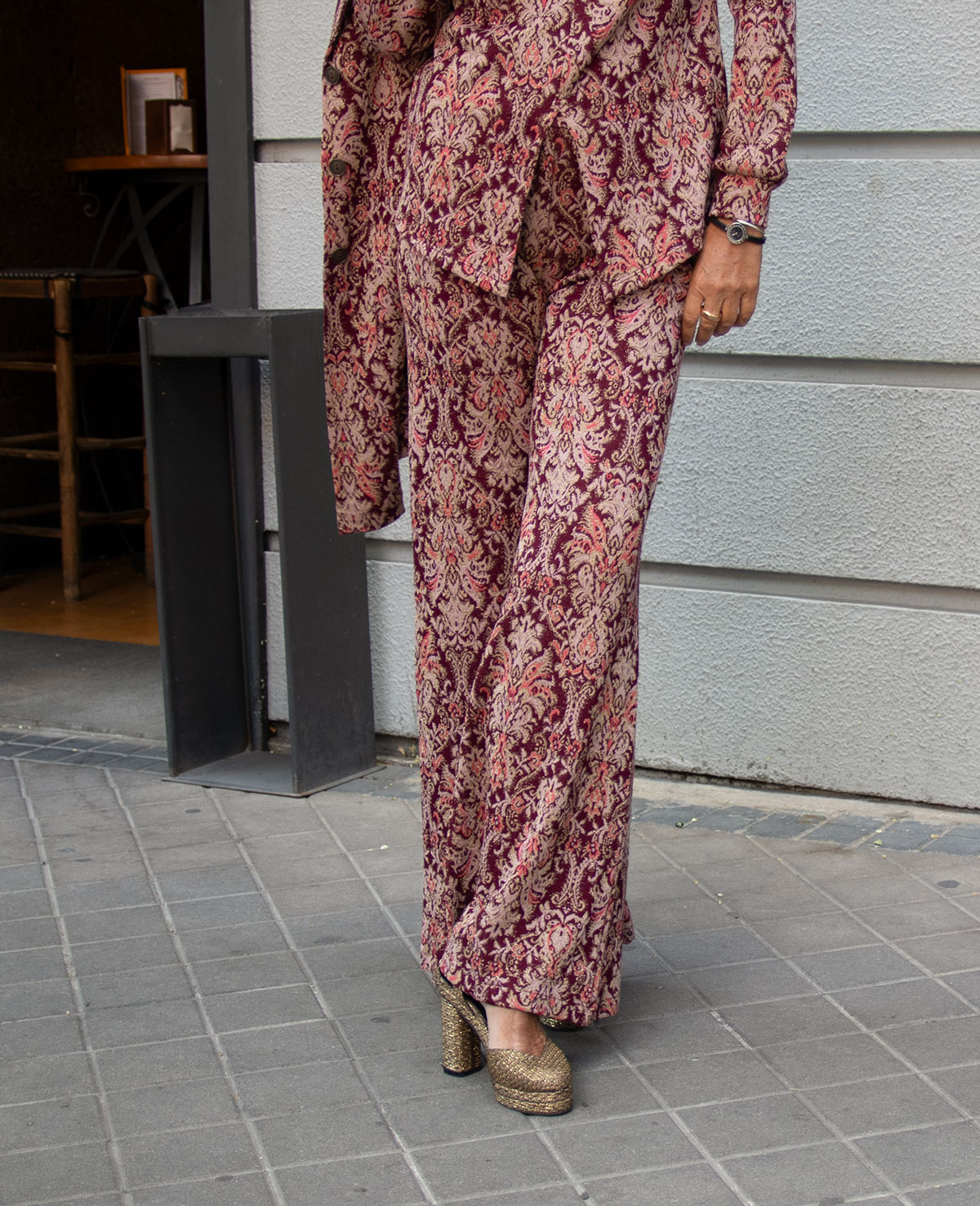 Pantalón flare con cinturilla elástica. Se puede combinare con el top y la chaqueta Ainara.