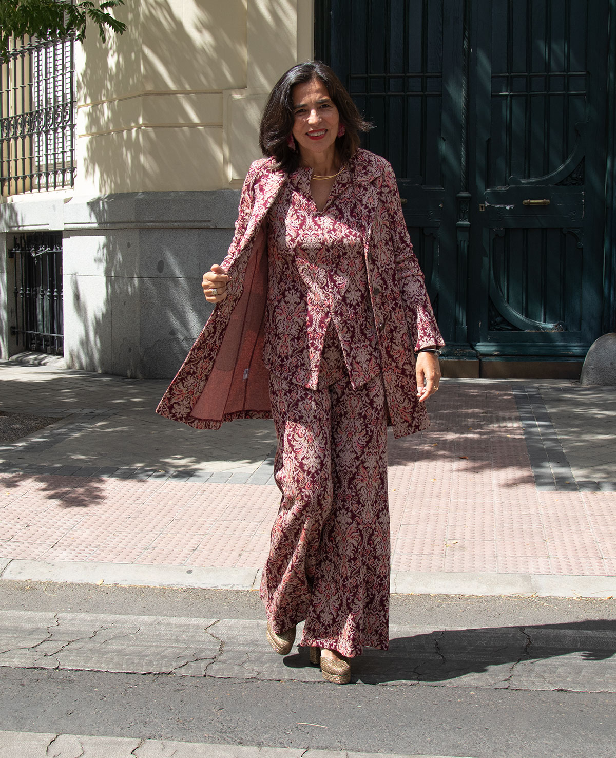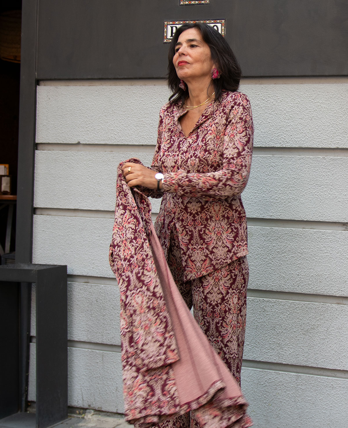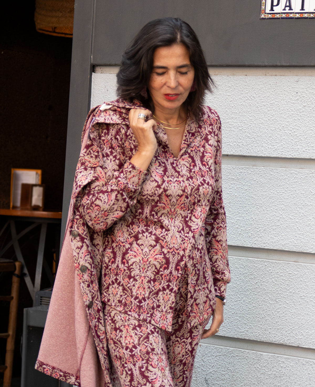Top en punto estampado con brillo. Manga larga con puño, escote en pico y abertura delantera. Se puede combinar con el pantalón y la chaqueta Ainara