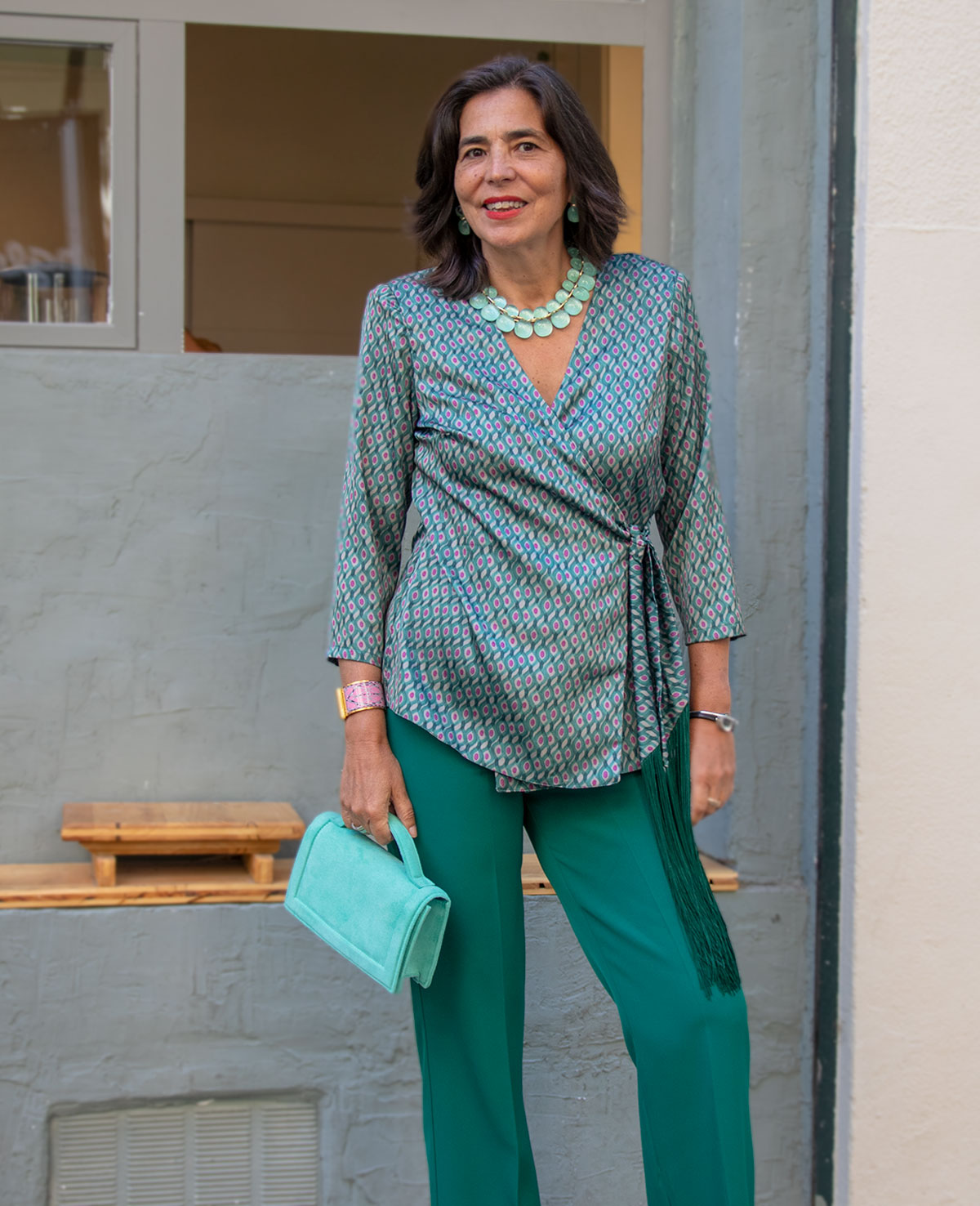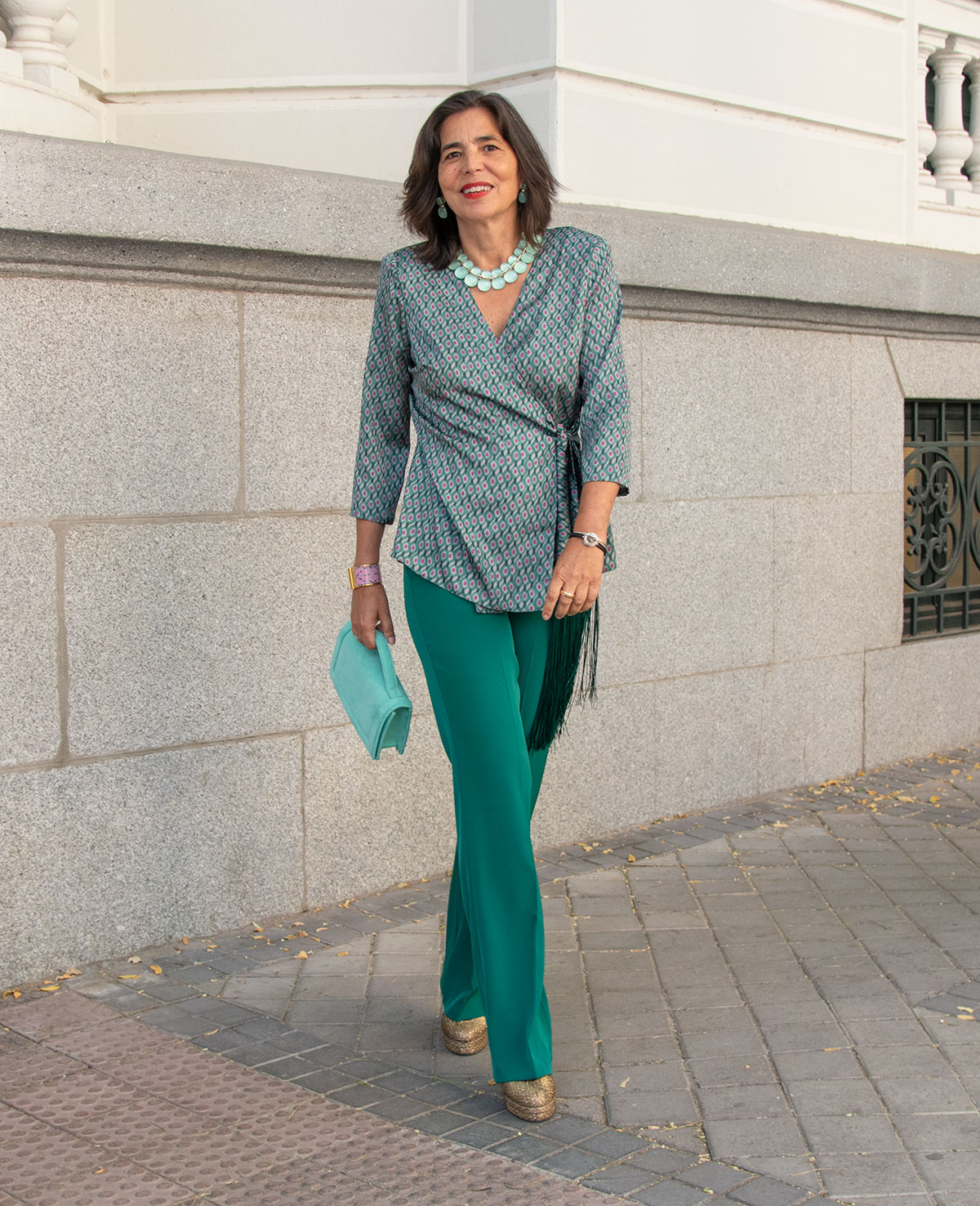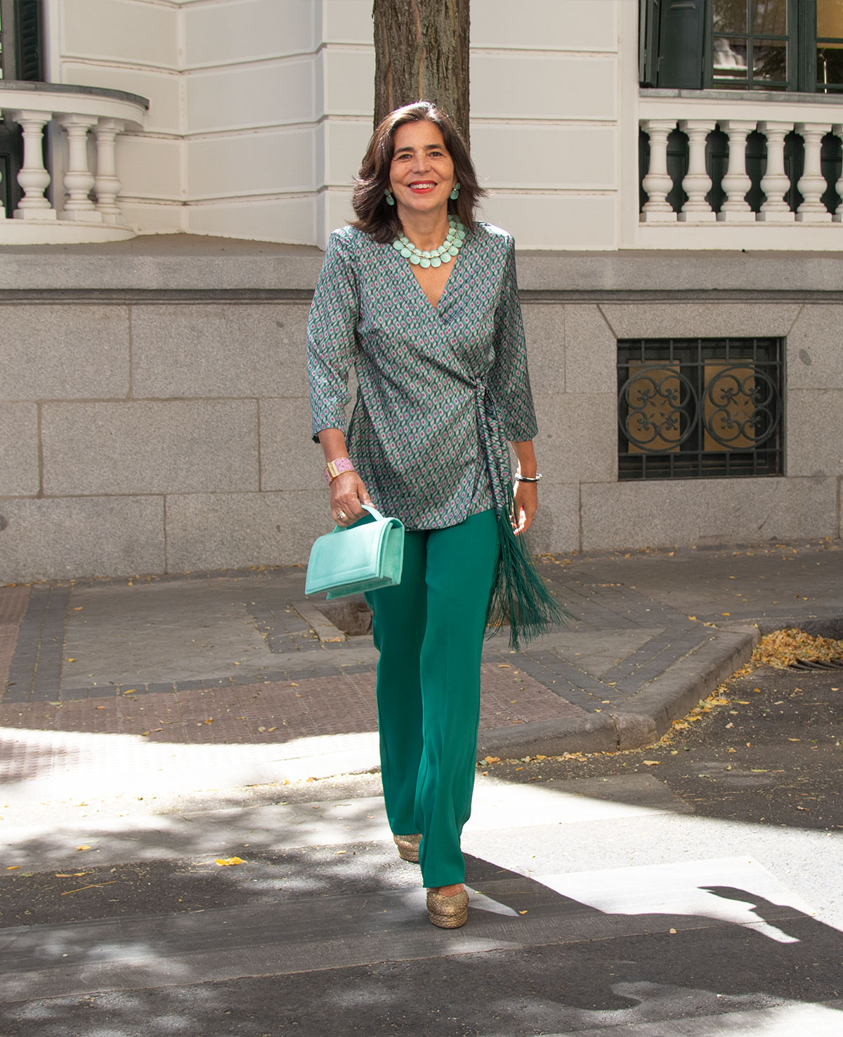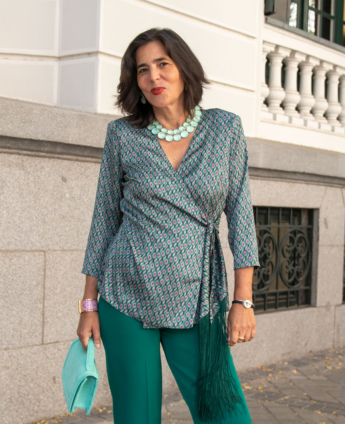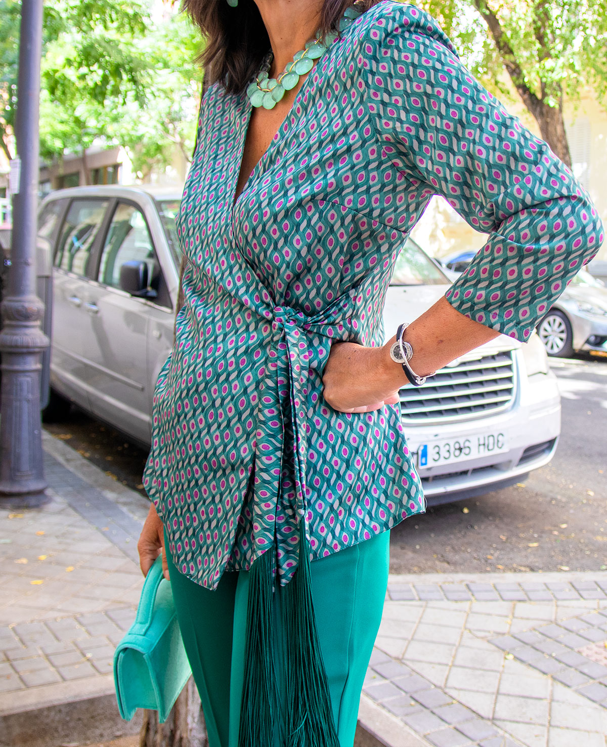 Conjunto de pantalón recto y blusa cruzada, lazada con adorno de flecos y manga francesa. Perfecto para invitadas de boda.