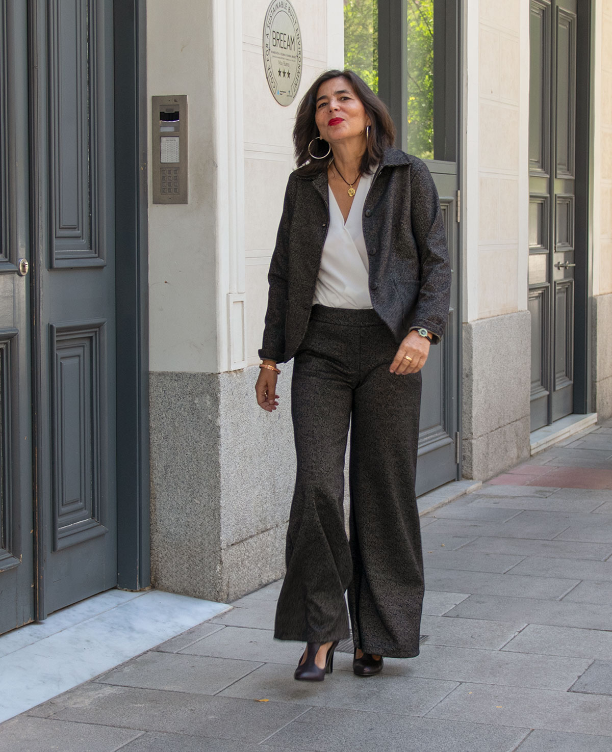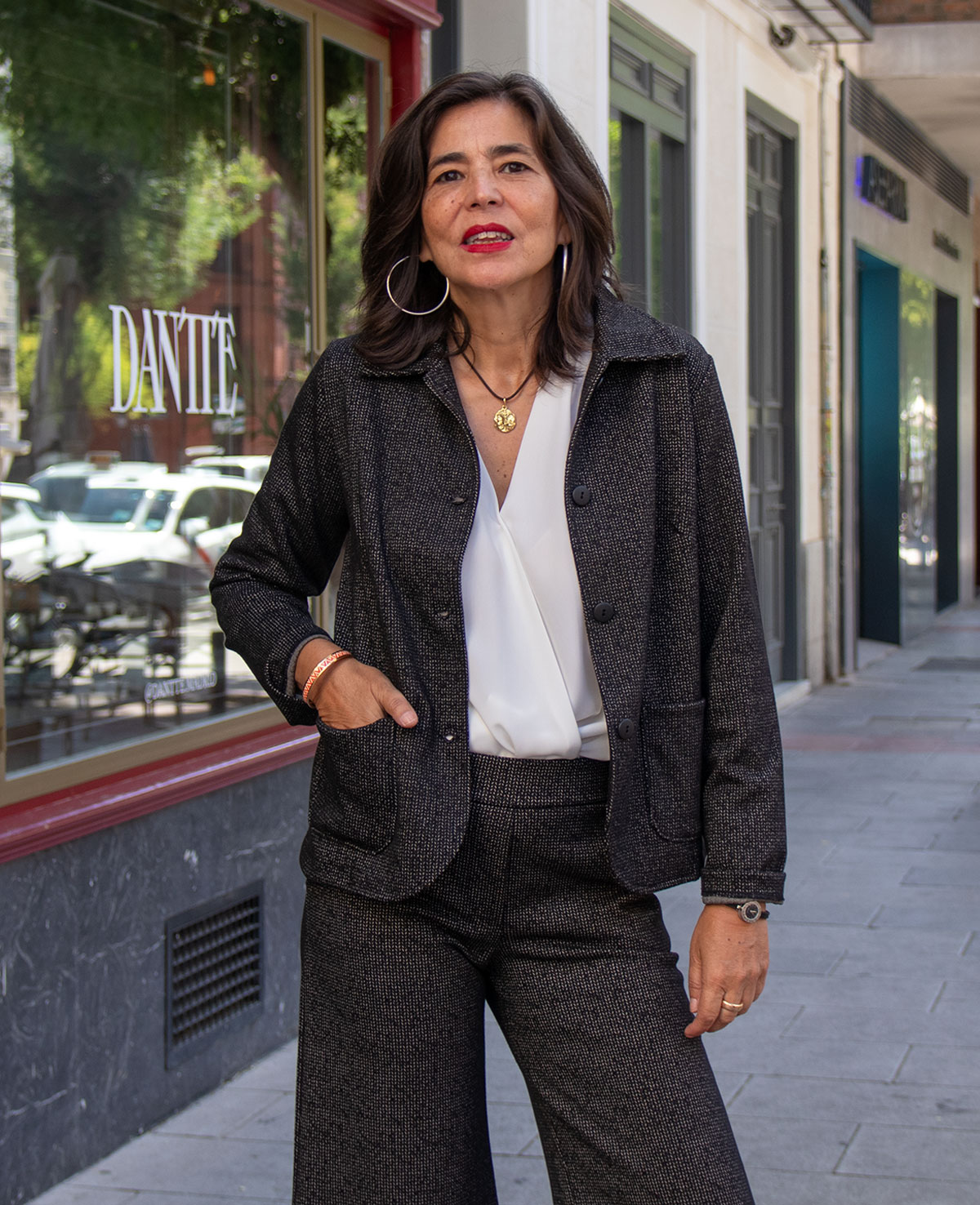 Chaqueta semi entallada con cuello camisero, cierre de botones y bolsillos delanteros. Se puede combinar con el pantalón Casilda.