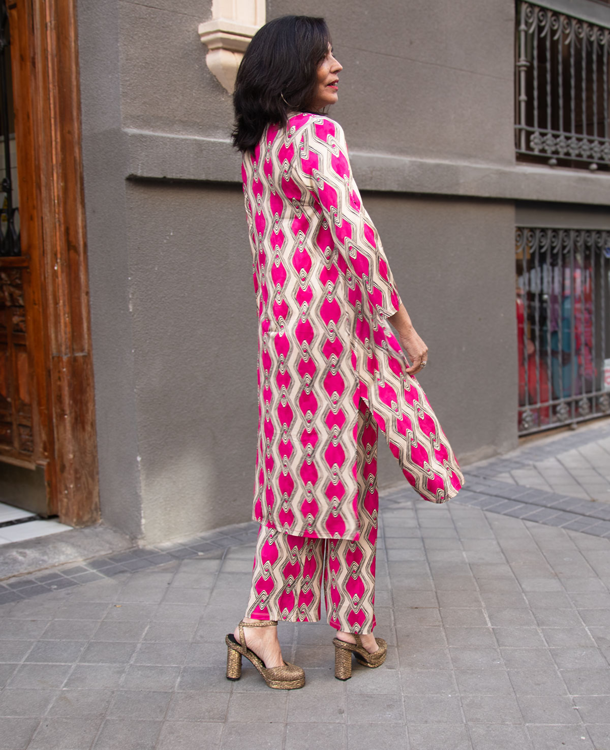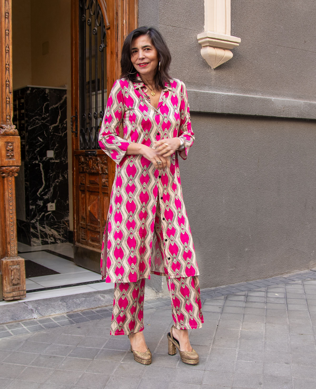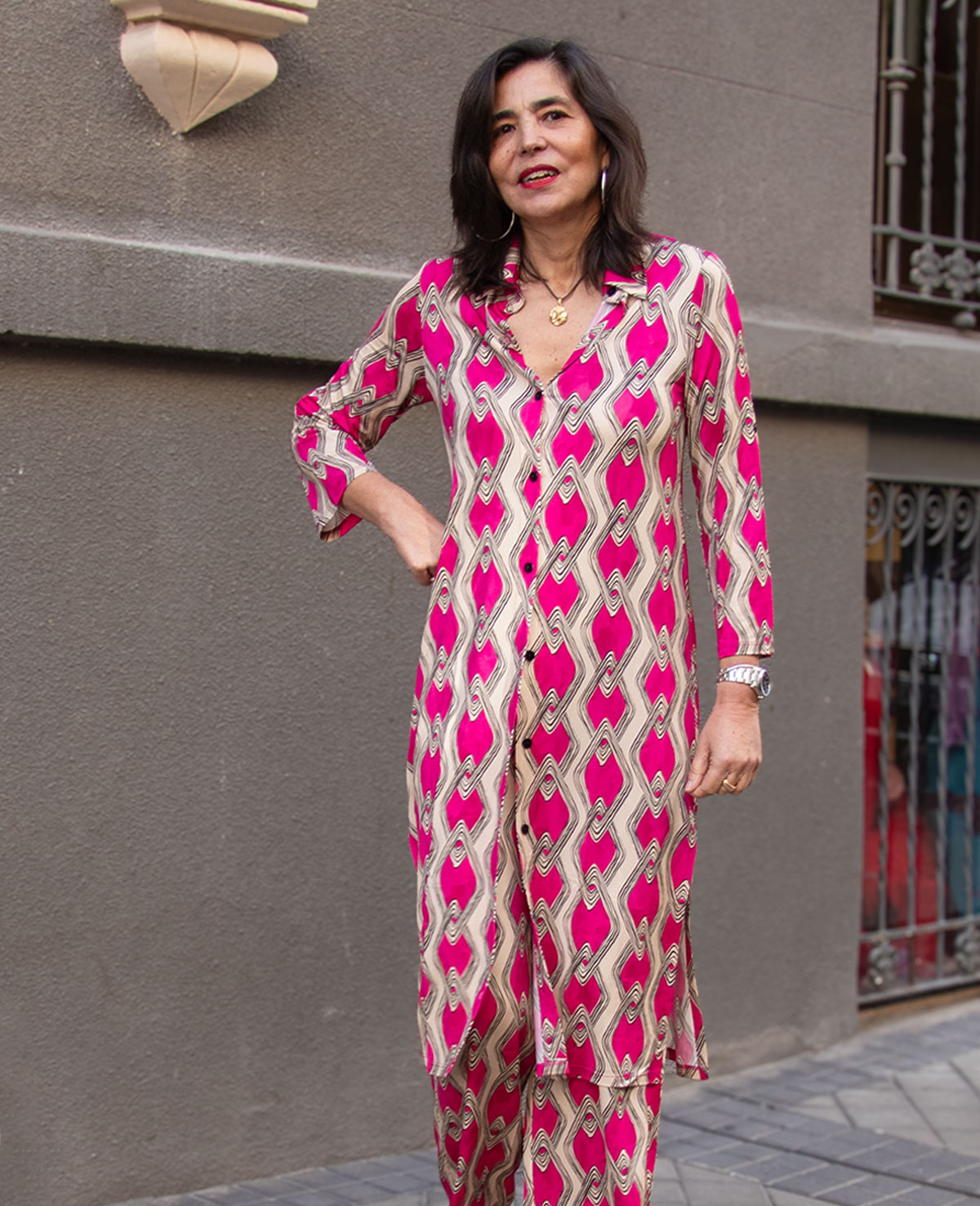 Guardapolvos con cuello camisero, manga francesa, cierre de botones y aberturas laterales. Se puede combinar con el pantalón Cintia. Ideal para ocasiones especiales.