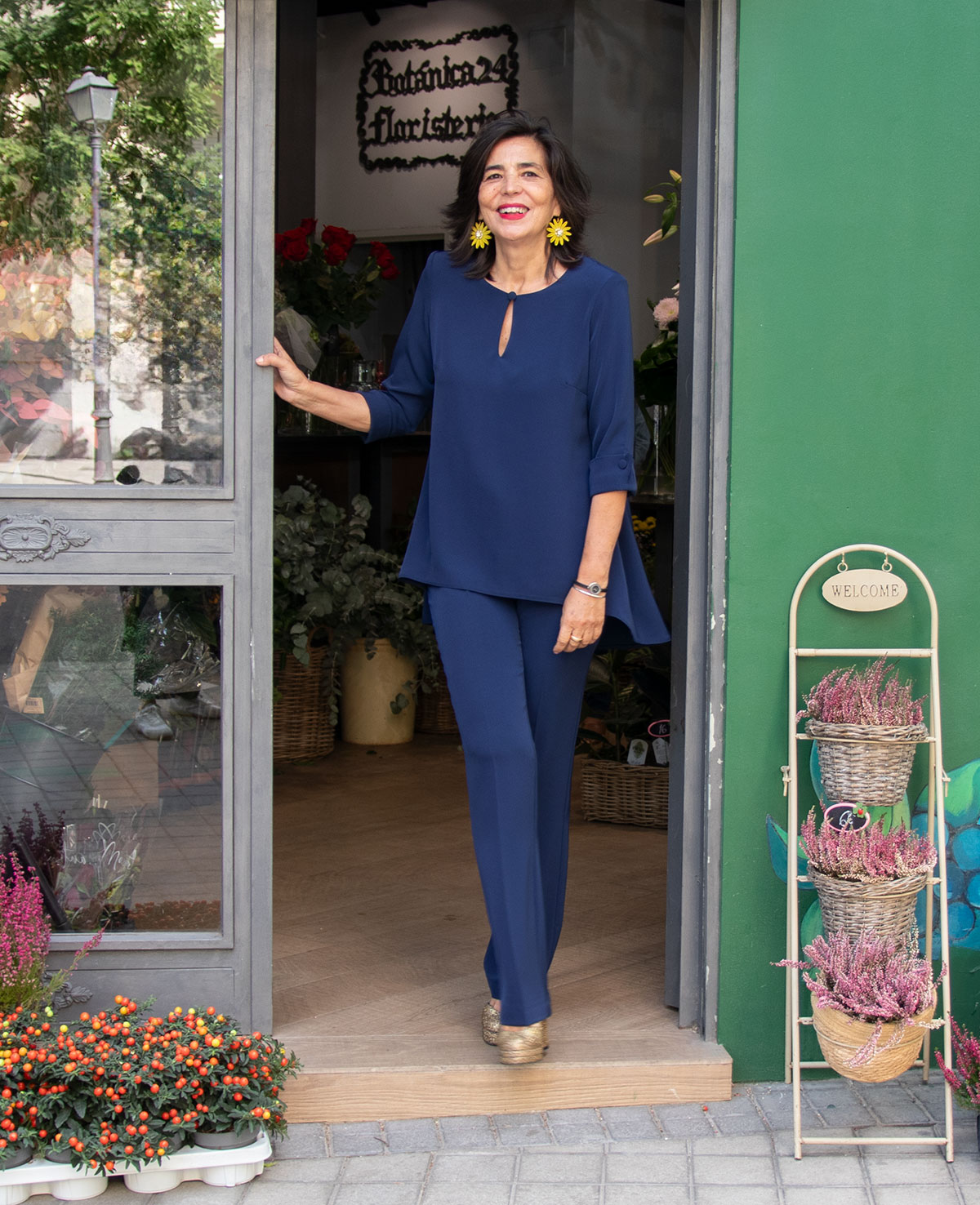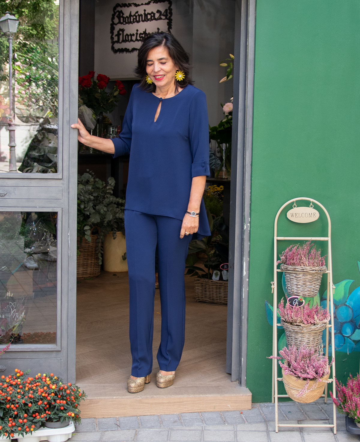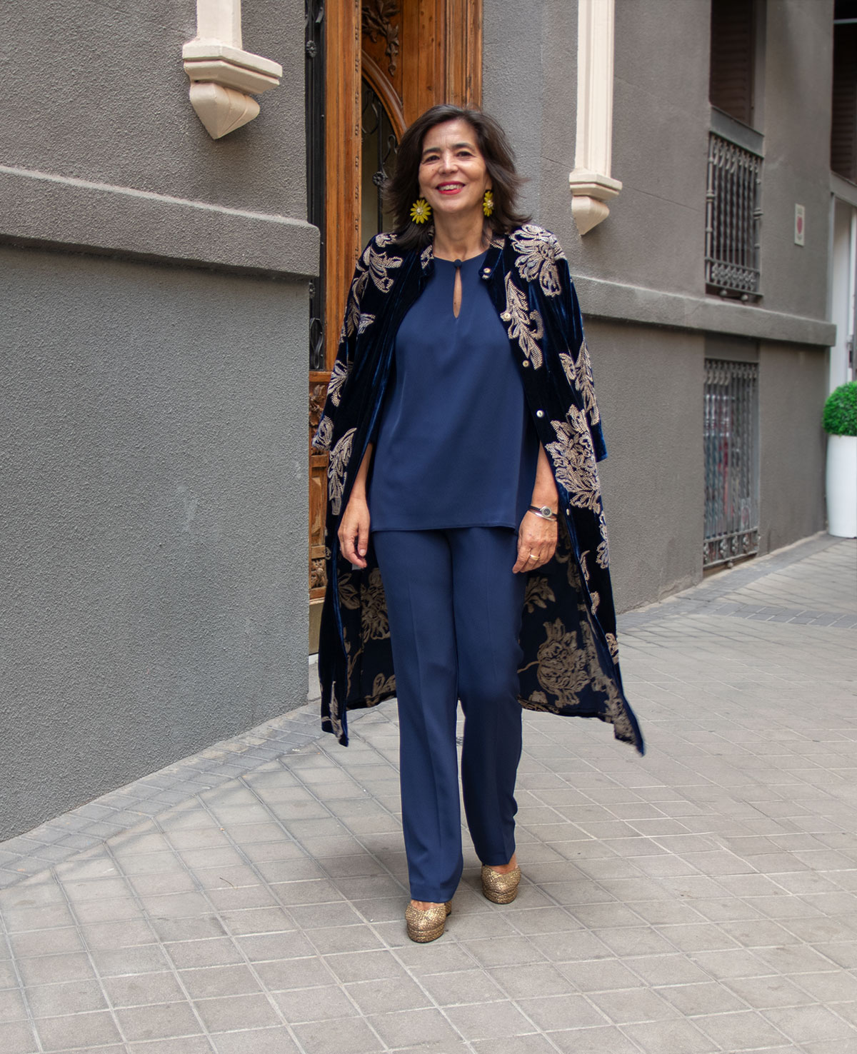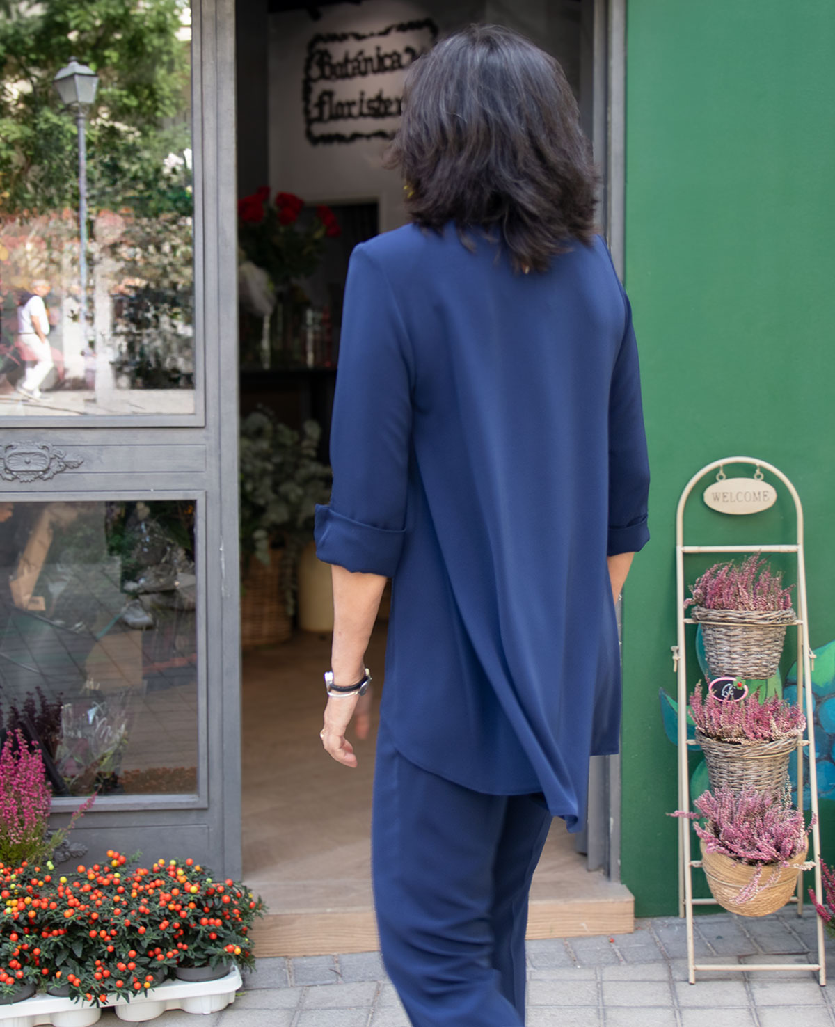 Conjunto para invitada con casaca de bajo asimétrico, manga francesa con adorno de puño y pantalón recto. Perfecto para las bodas de otoño e invierno.