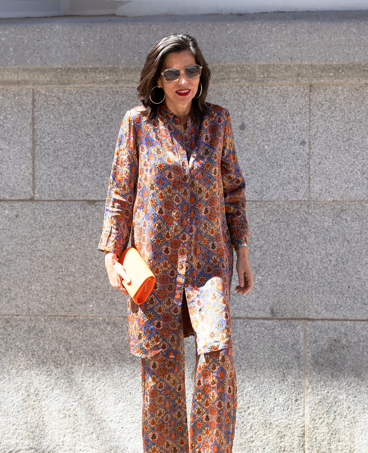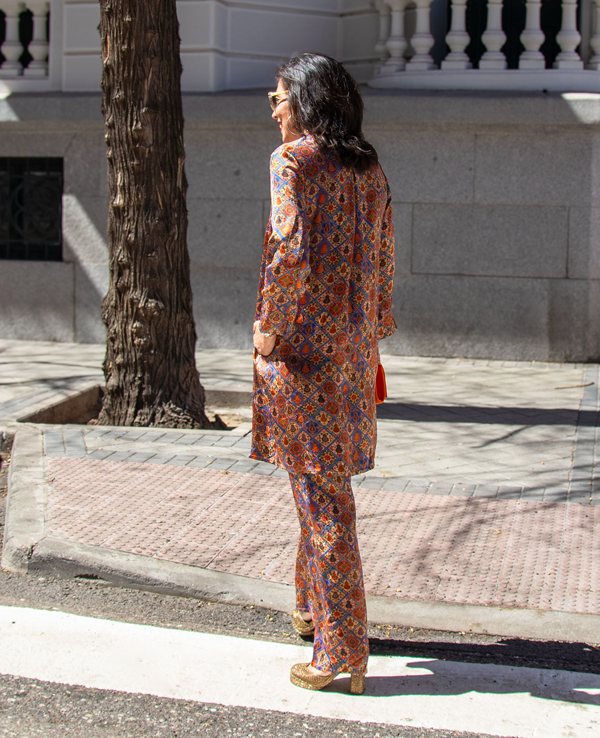 Guardapolvos con manga larga, cierre de botones y bolsillos laterales. Se puede combinar con el pantalón Elvia. Ideal para invitadas a boda o fiesta.
