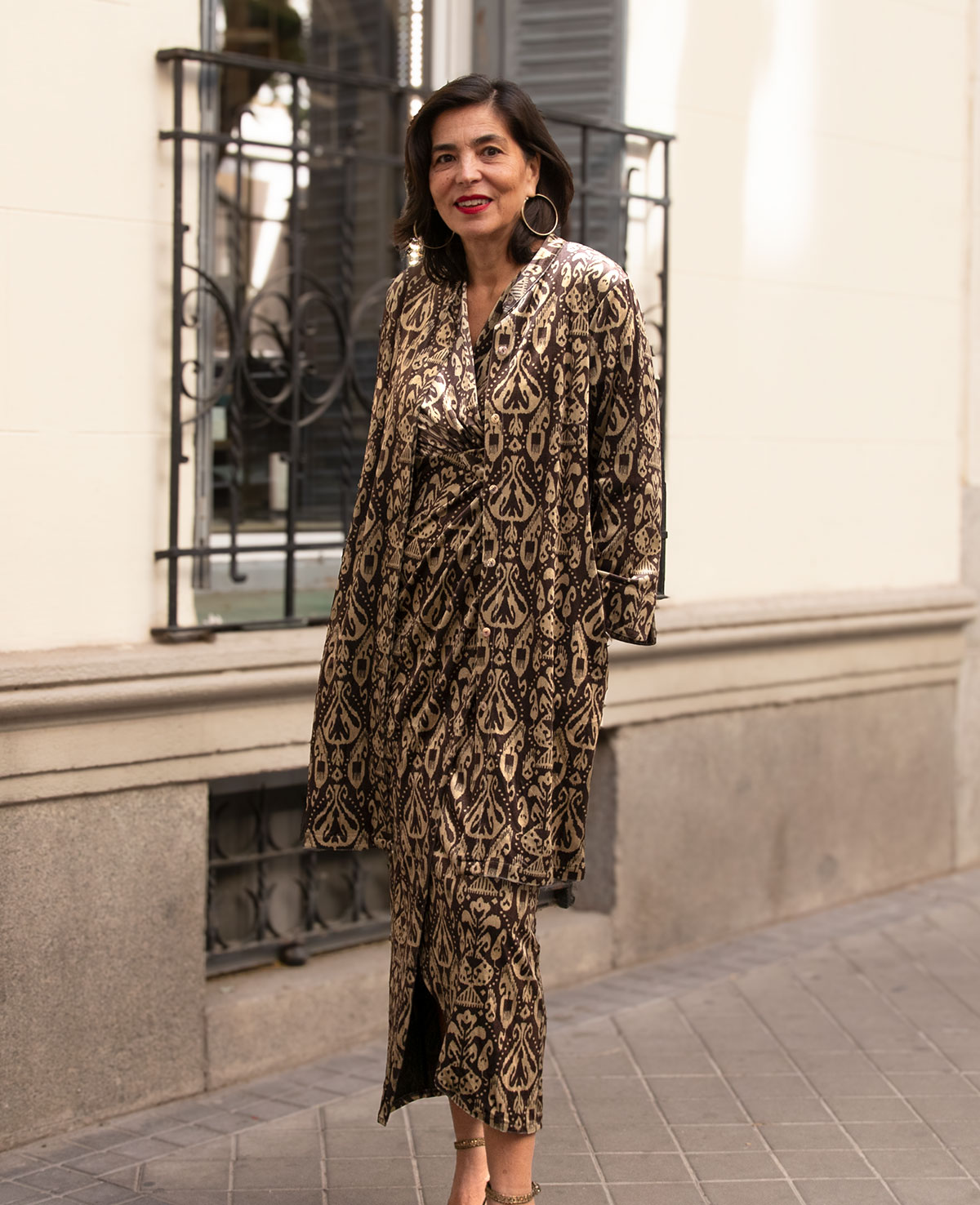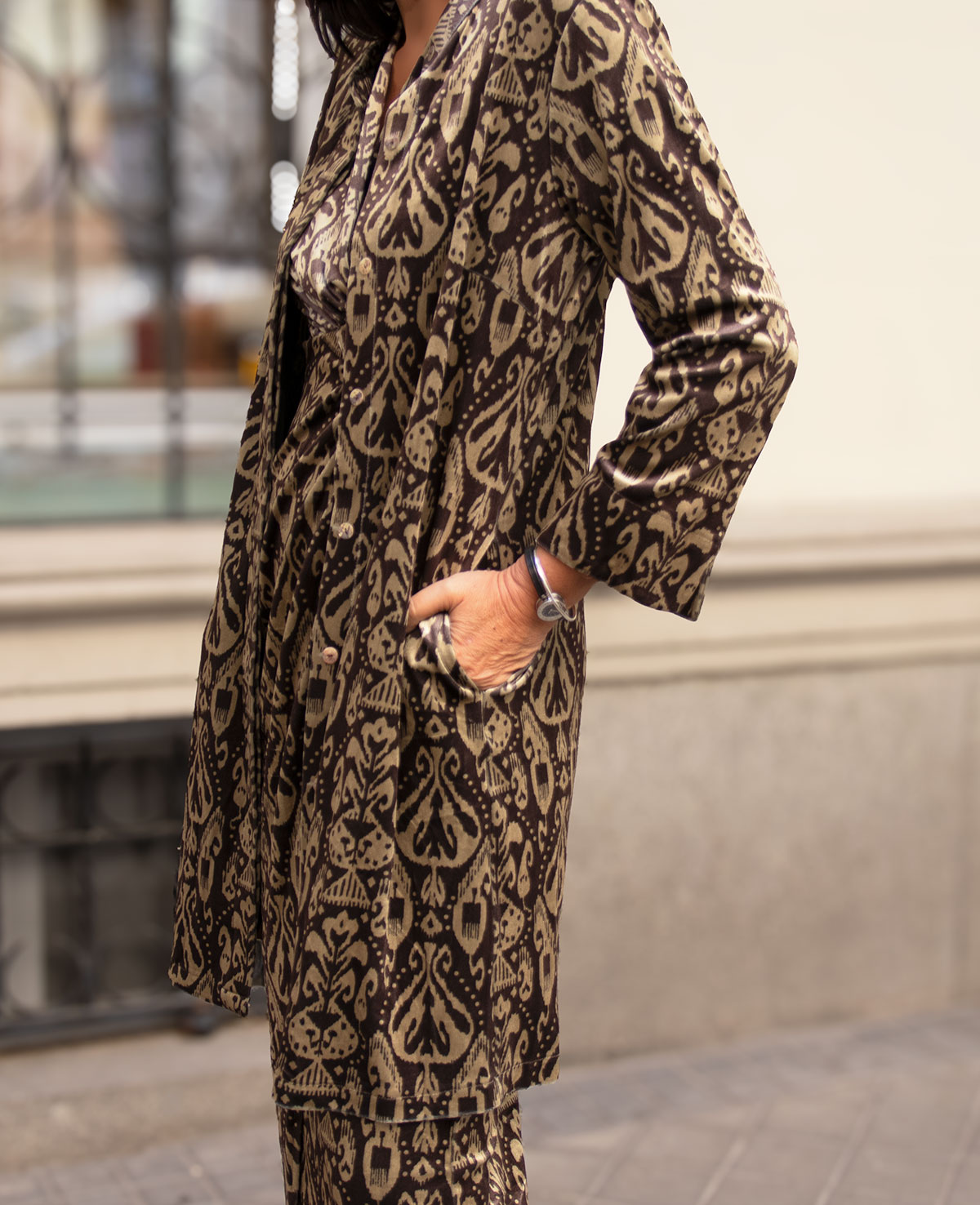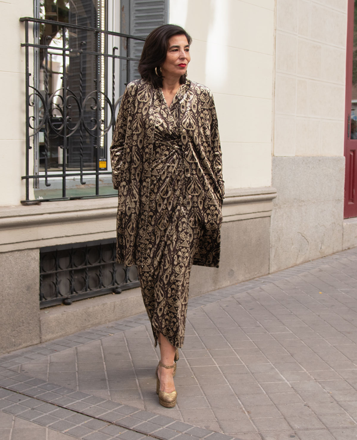 Guardapolvos de terciopelo con manga larga, cierre de botones y bolsillos laterales. Se puede combinar con el vestido y el pantalón Frida. Ideal para ocasiones especiales.