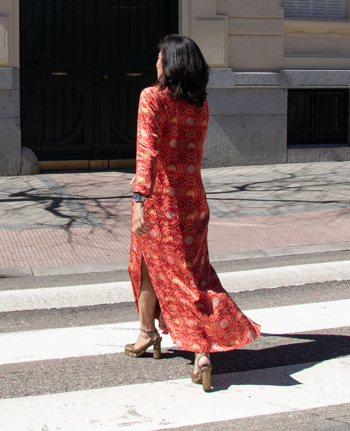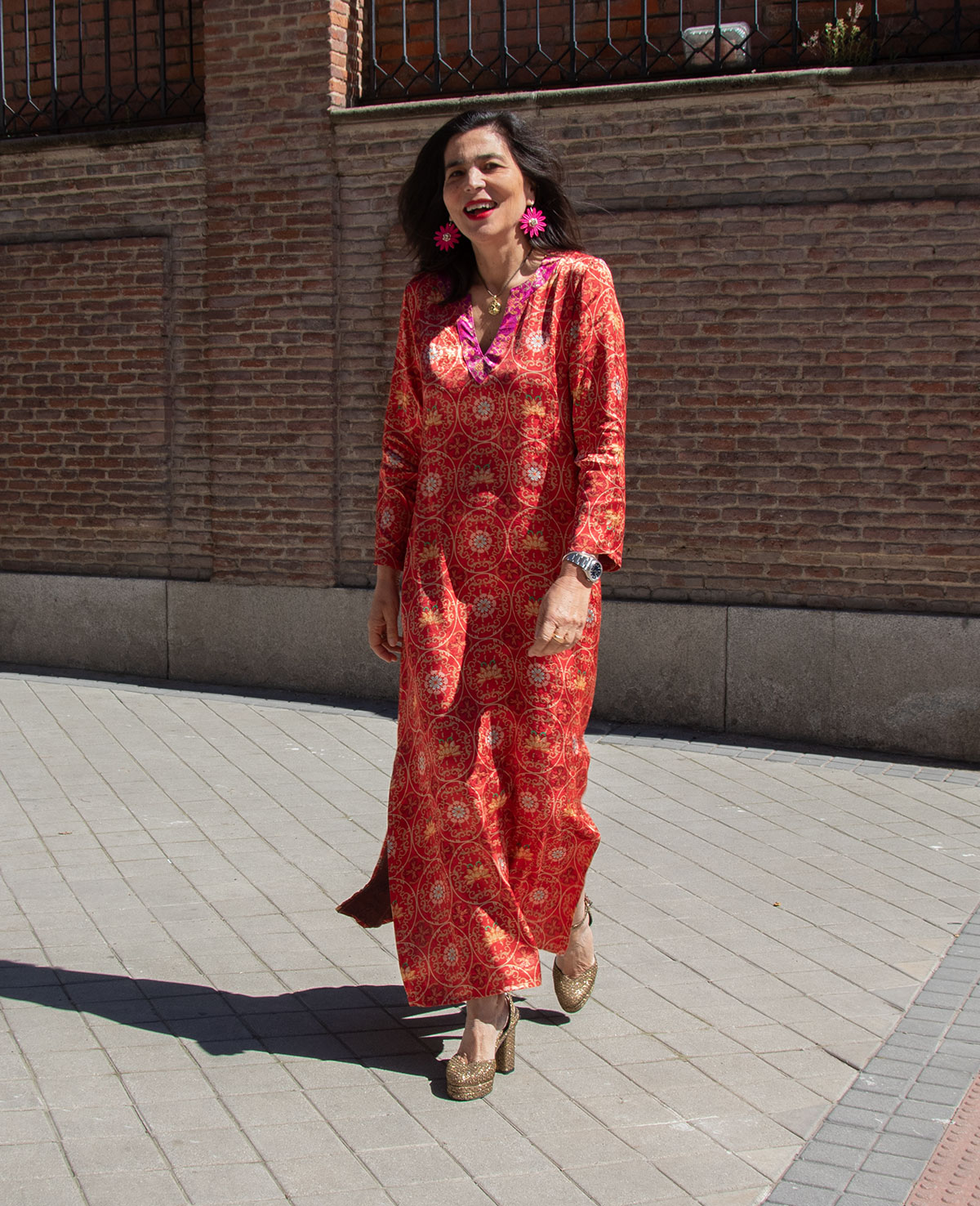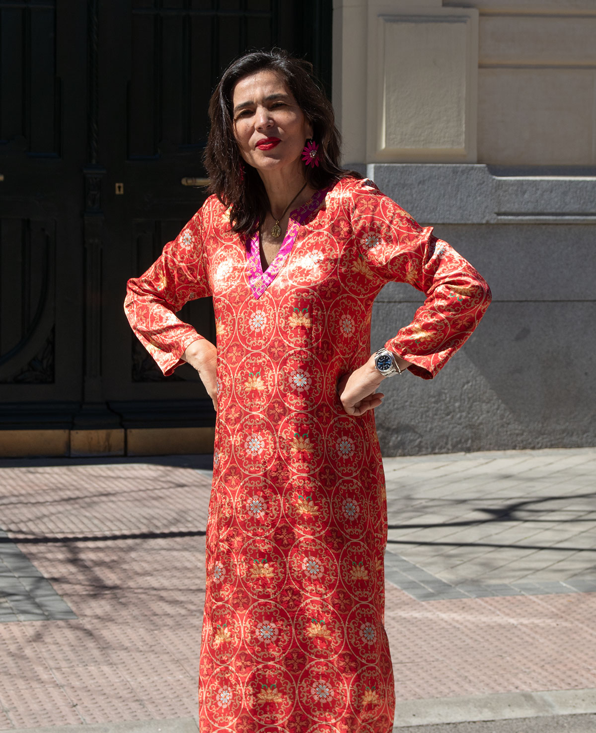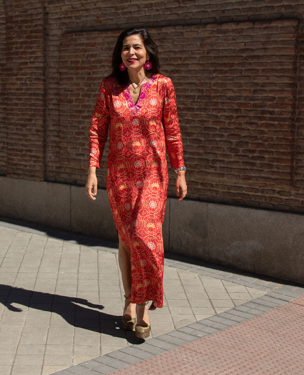 Vestido tipo kaftán de corte recto con manga larga, abertura lateral y escote en pico con adorno de vivo. Ideal para invitada a boda o fiesta.