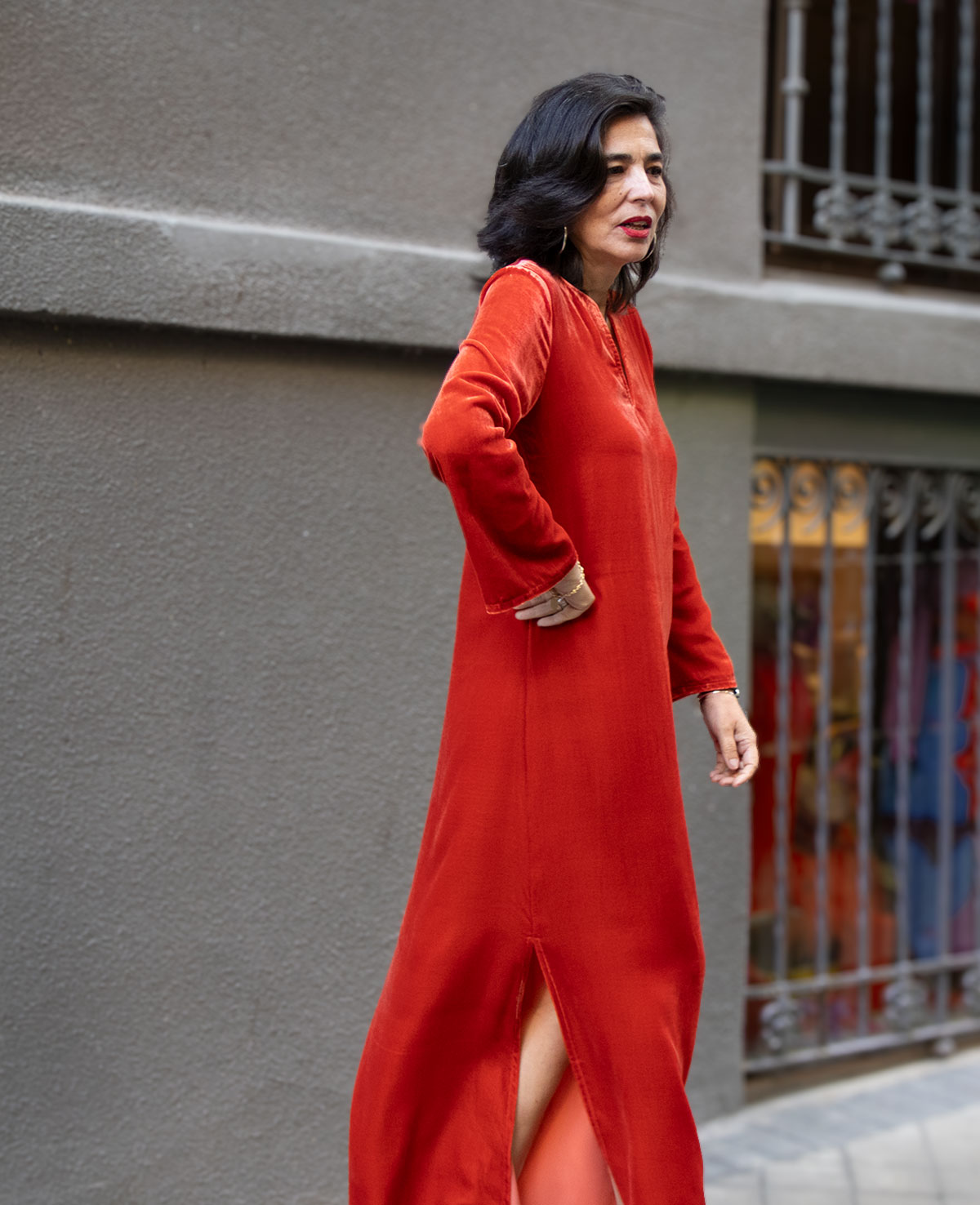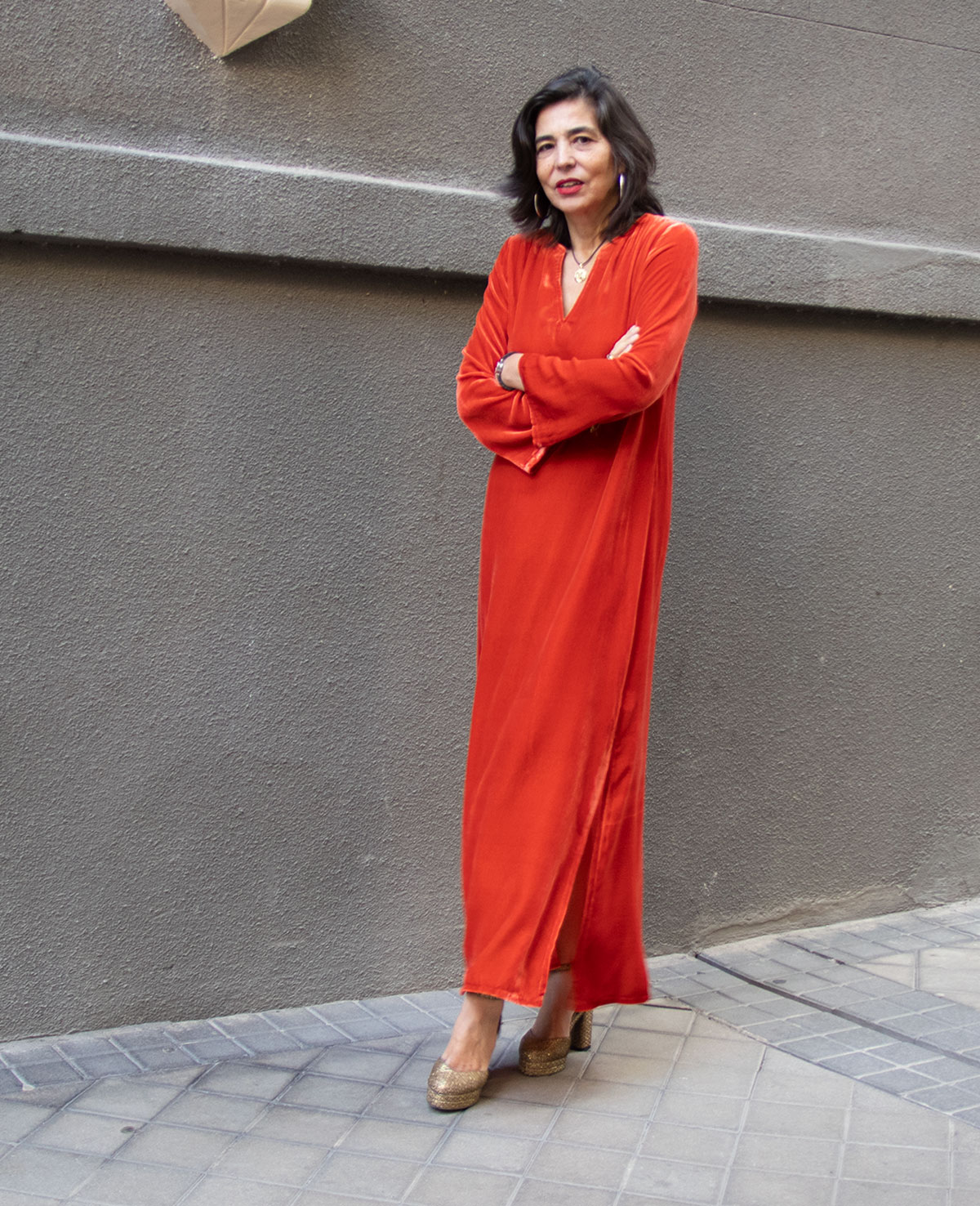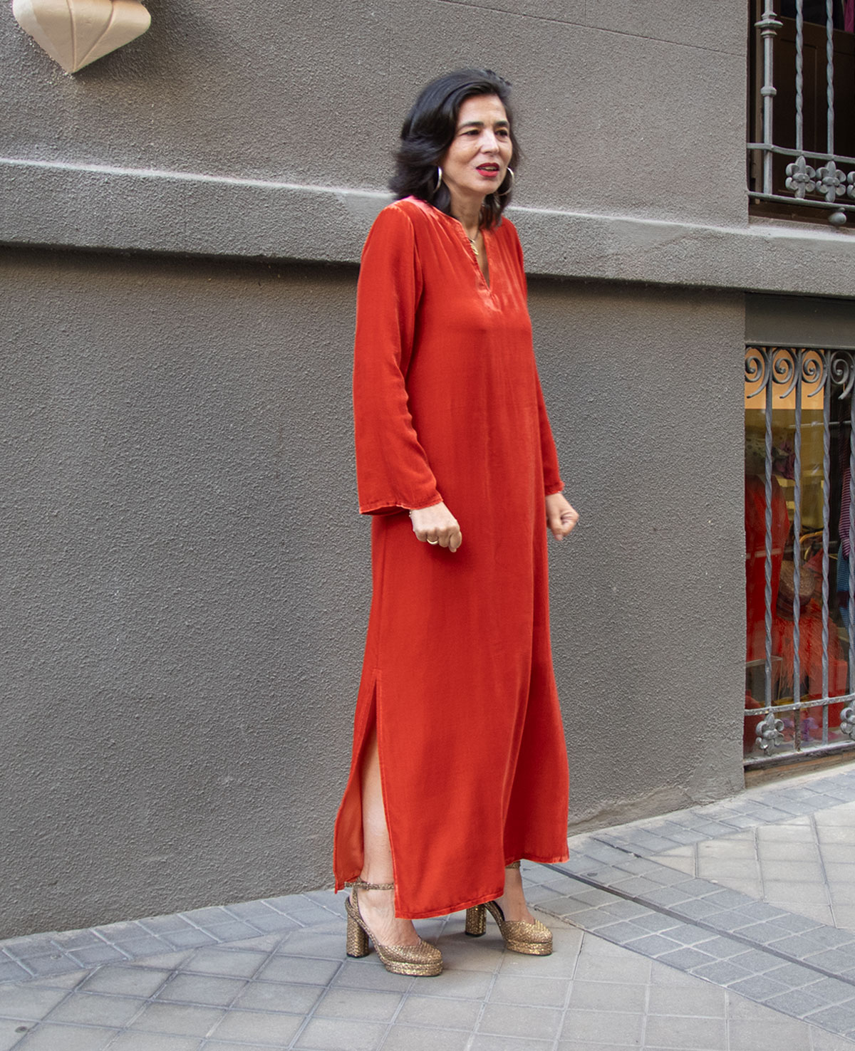 Vestido tipo kaftán en terciopelo de seda. Manga larga acampanada y aberturas laterales. Perfecto para ocasiones especiales.