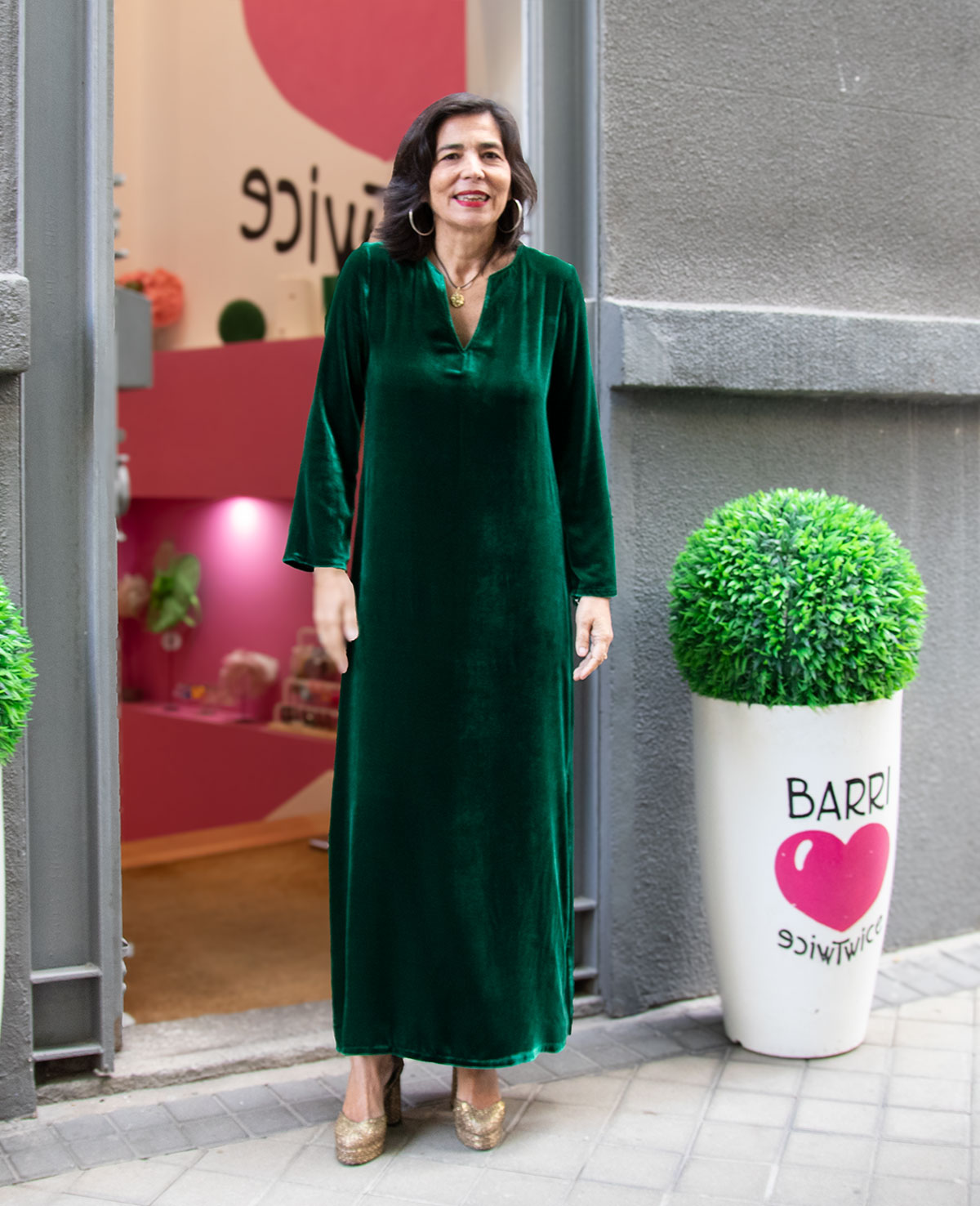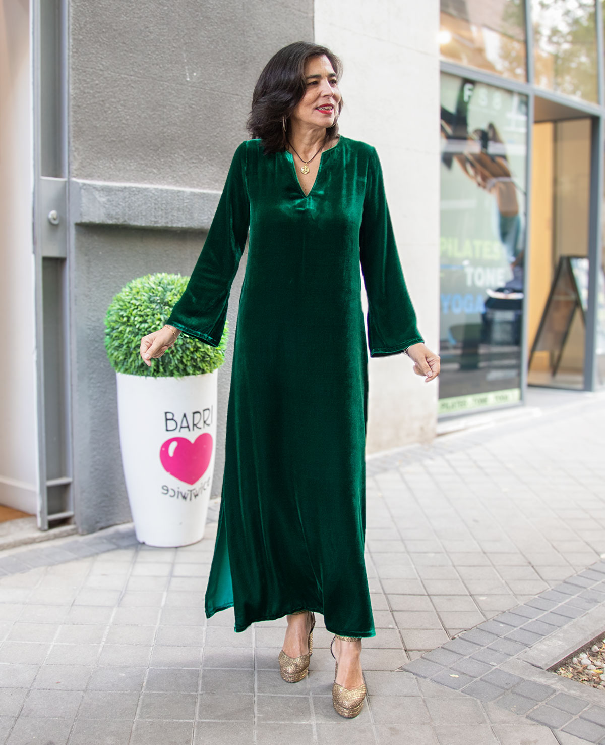 Vestido tipo kaftán en terciopelo de seda. Manga larga acampanada y aberturas laterales. Perfecto para ocasiones especiales.