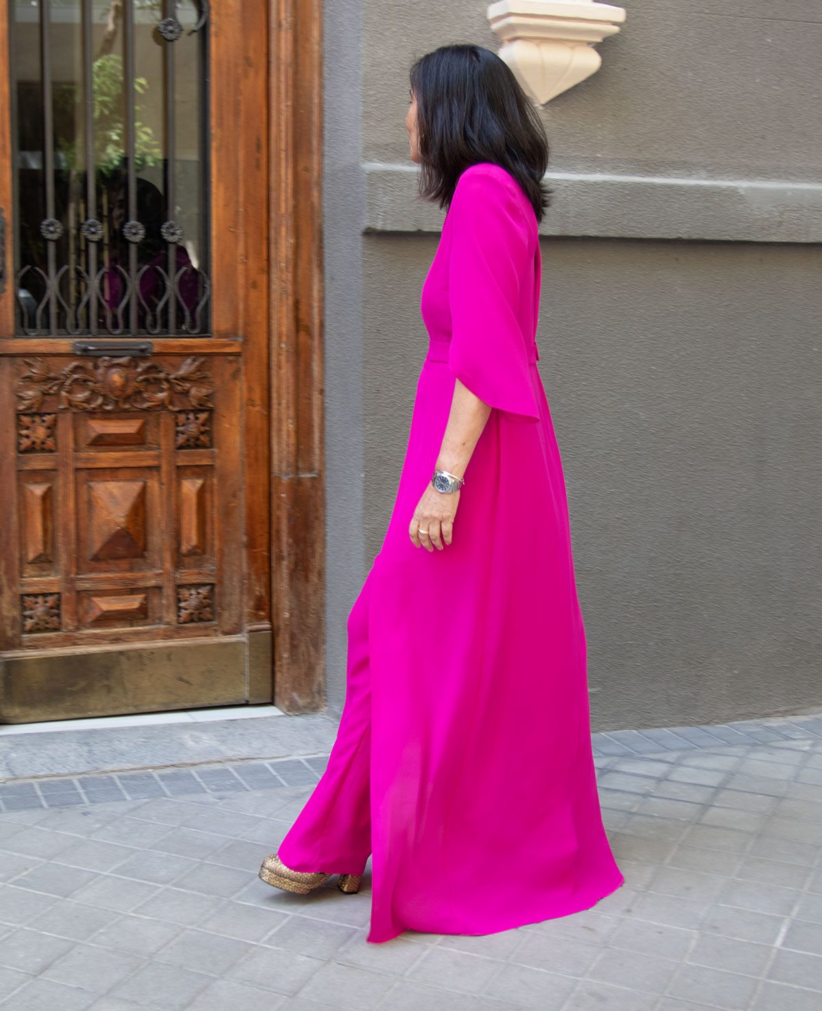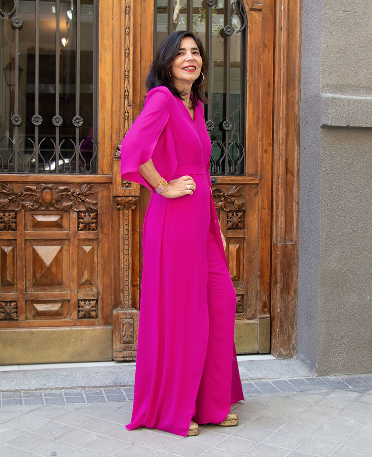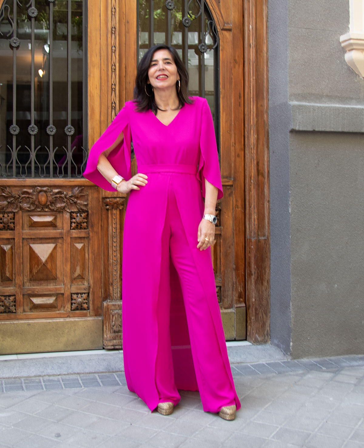 Mono. de fiesta con pantalón recto y túnica con gran abertura delantera. Manga acampanada con abertura y cinturón. Ideal para invitada a boda.
