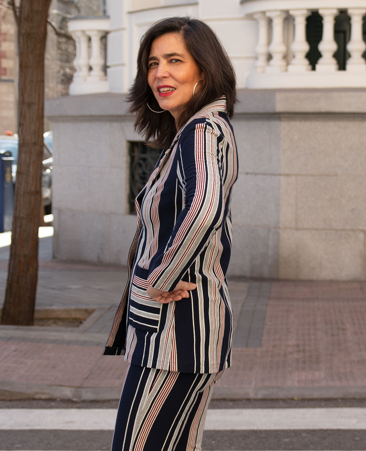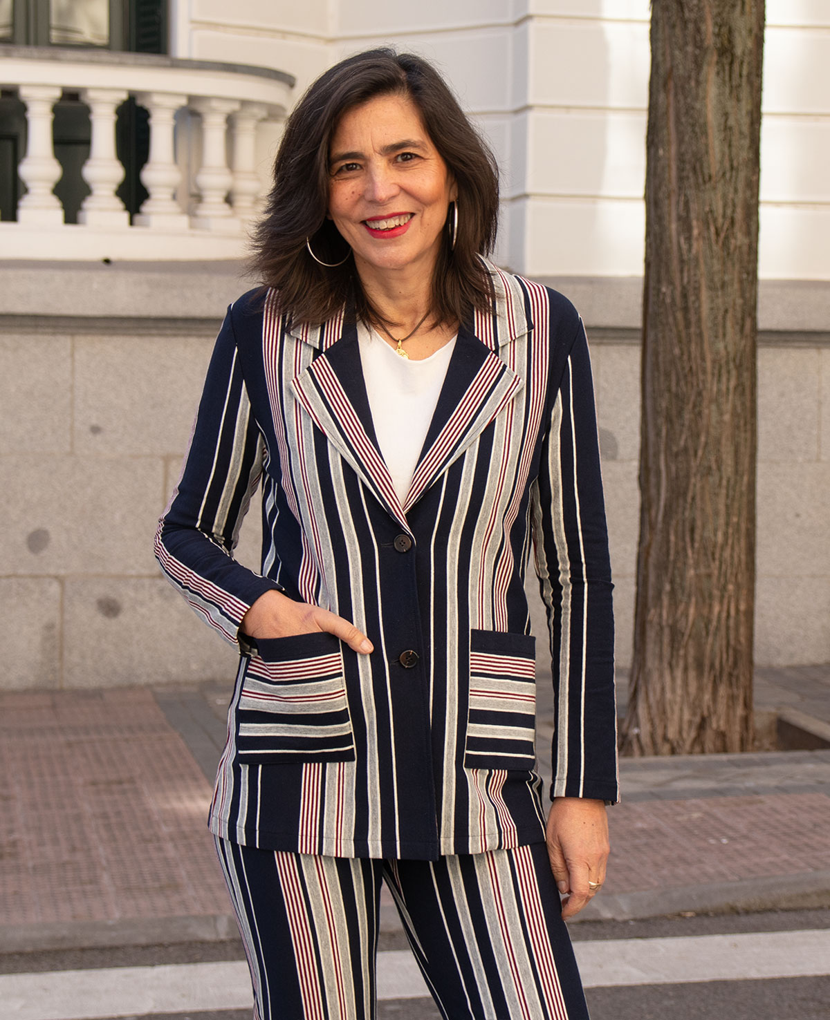 Chaqueta de punto tipo blazer con cierre de botones y bolsillos de plastón. Se puede combinar con el pantalón de rayas azul y gris. Ideal para el día a día.