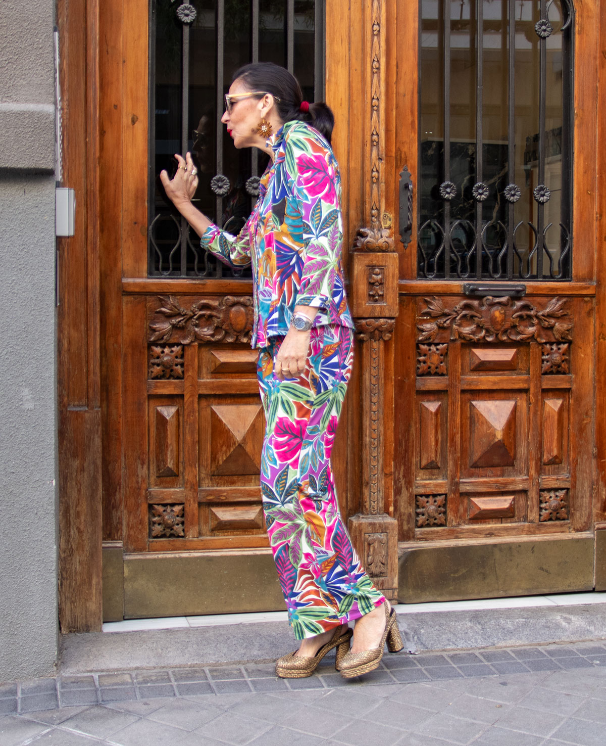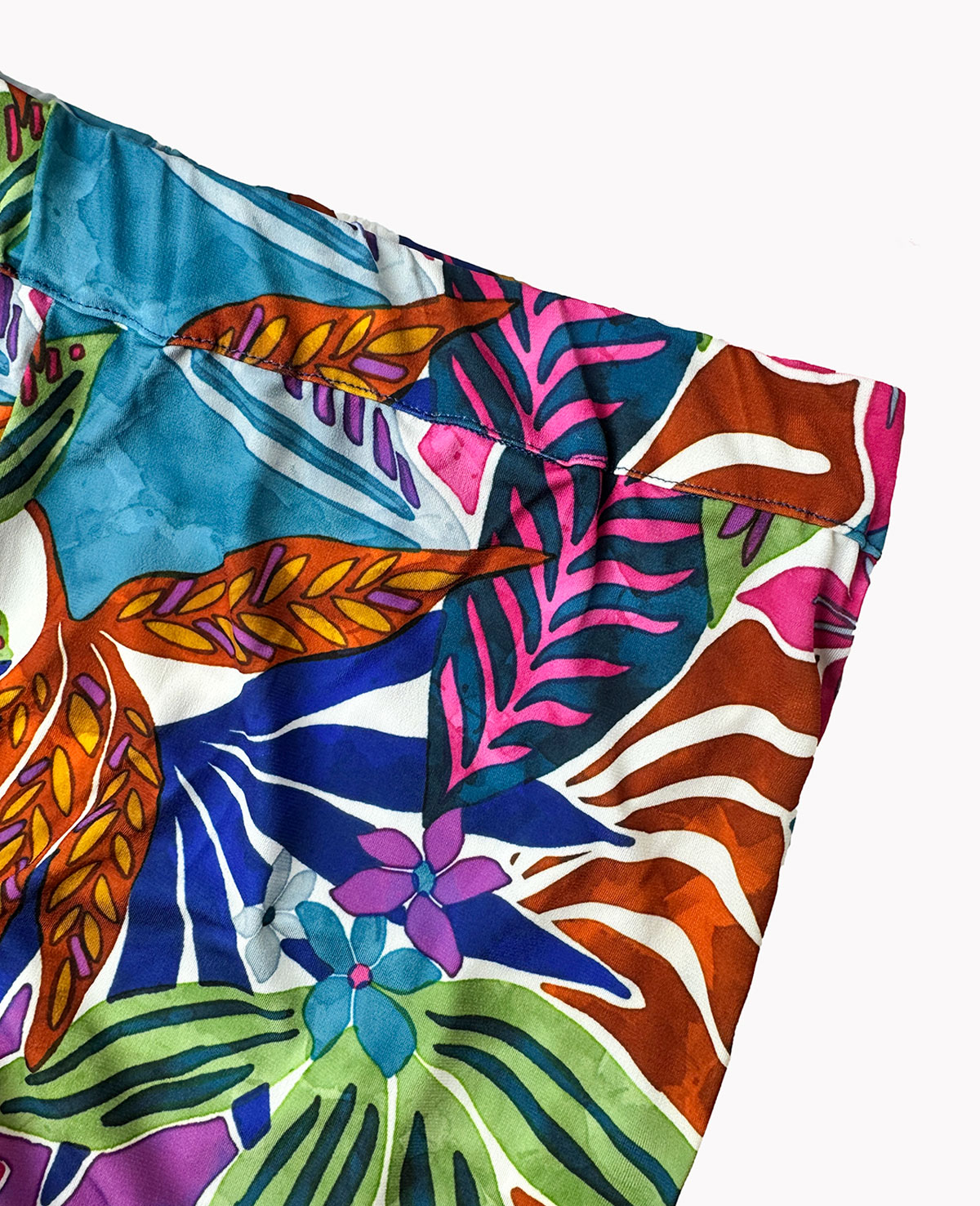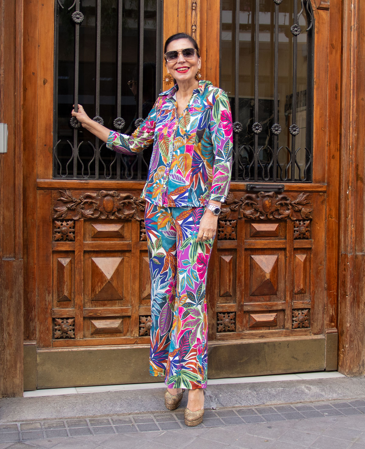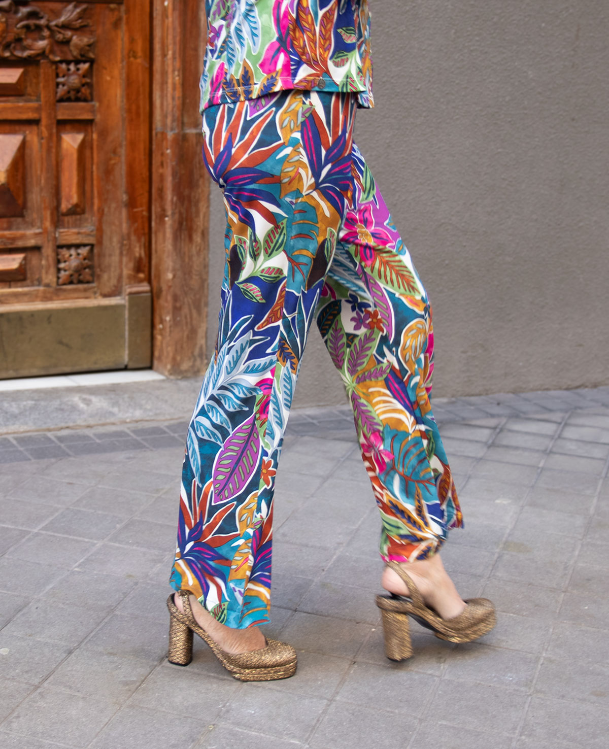 Pantalón flare con cinturilla elástica. Se puede combinar con la camisa Teresa multicolor azul. Ideal para el día a día.