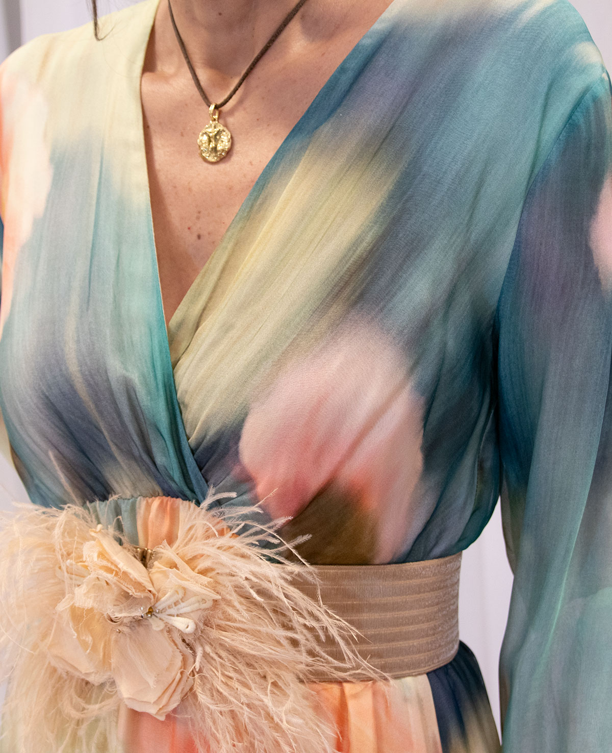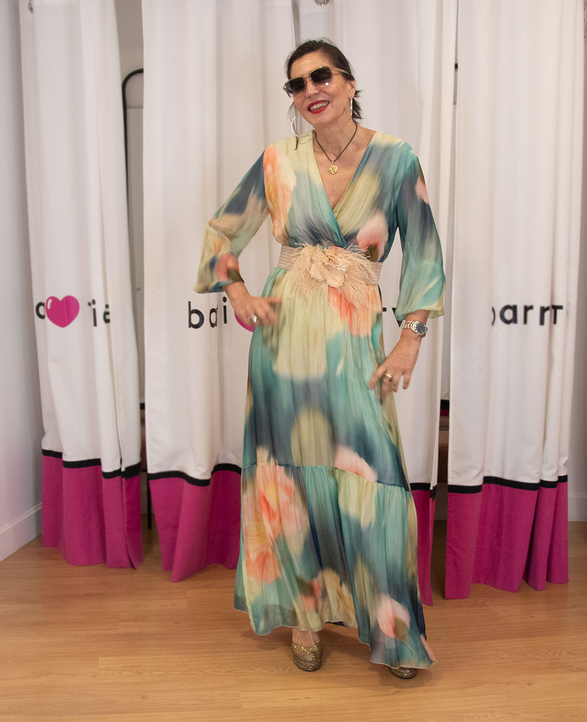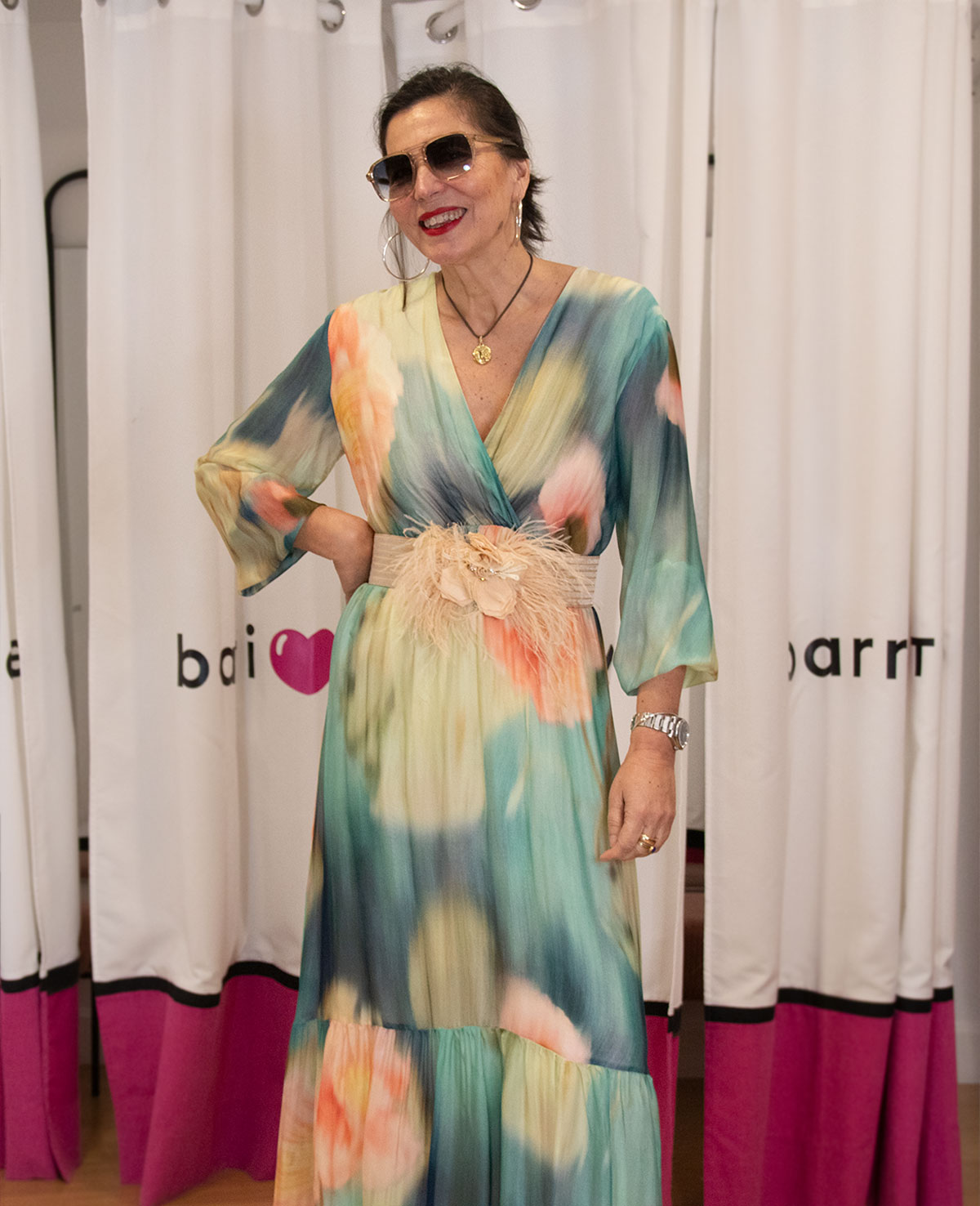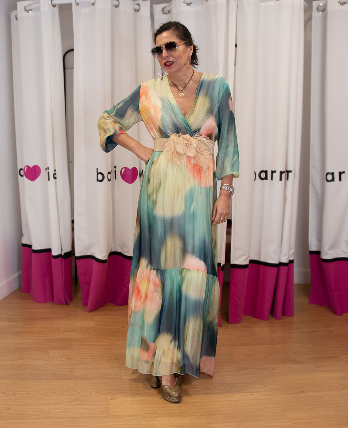 Vestido largo con escote cruzado en pico, manga francesa con puño elástico y volante en el bajo. Ideal para invitada a boda de mañana.249