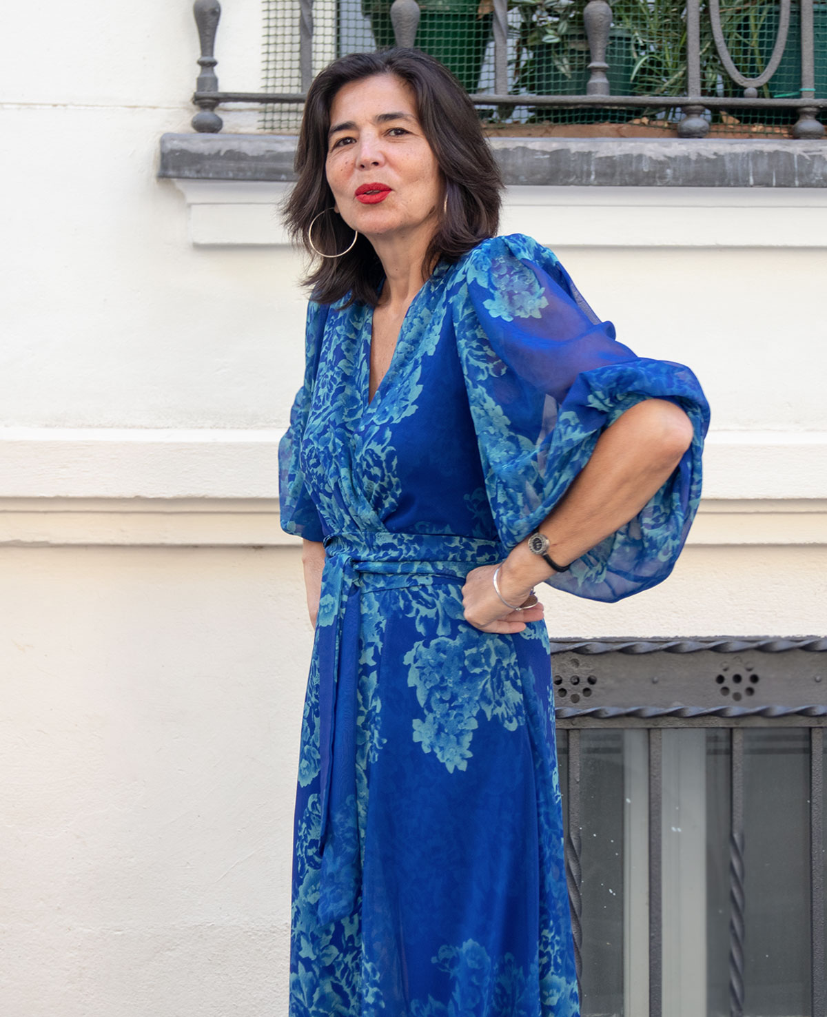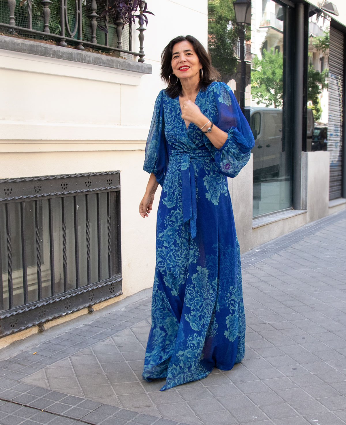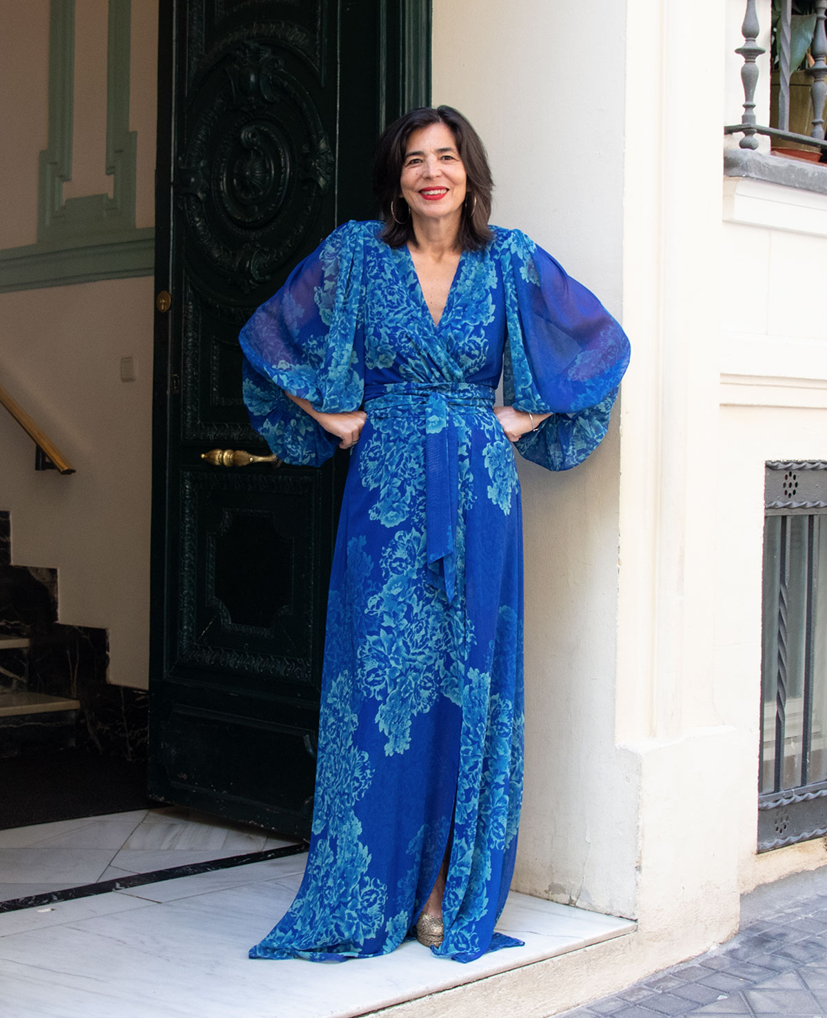 Vestido de fiesta largo con escote cruzado, manga abullonada, abertura delantera y cinturón. Ideal para invitadas.