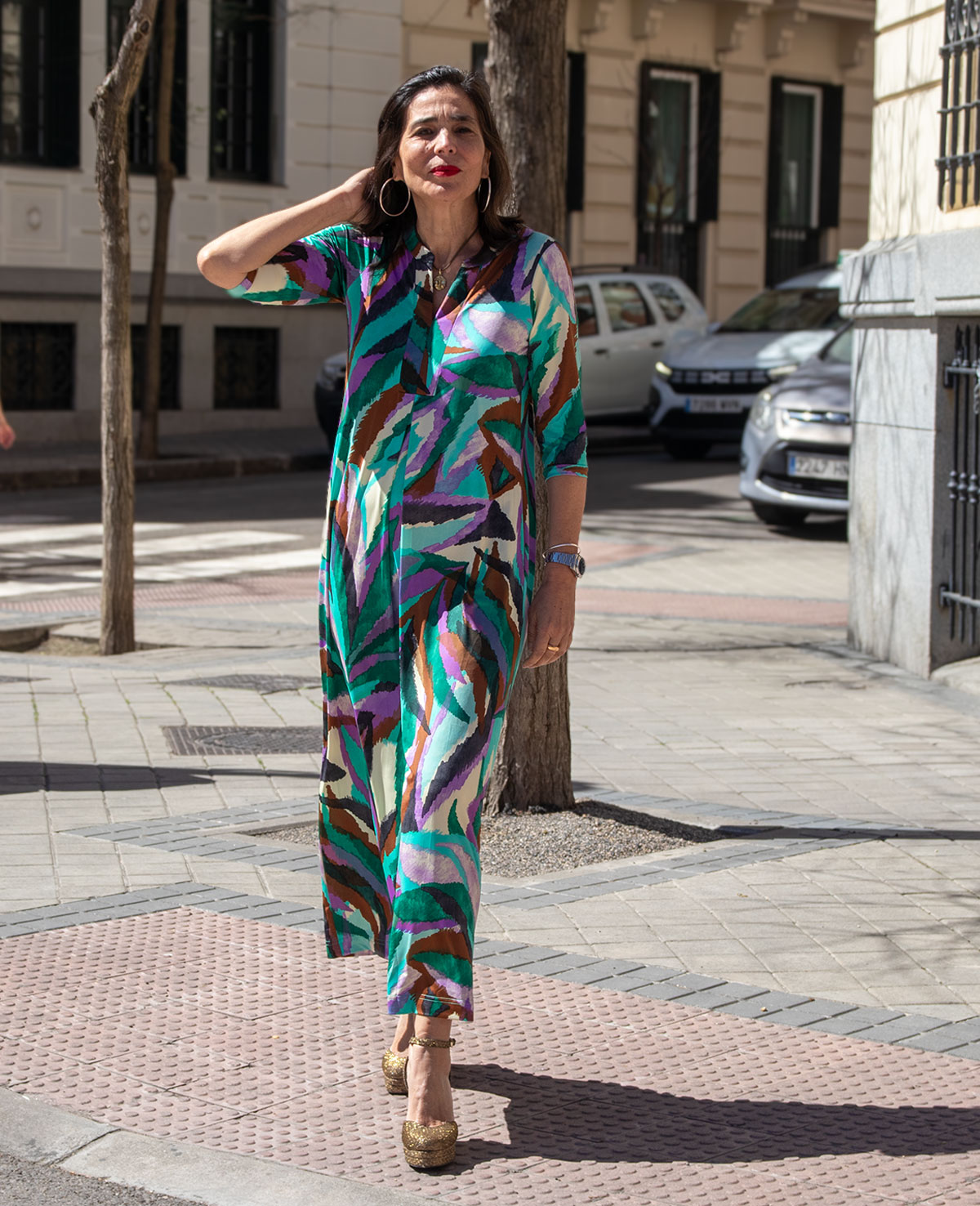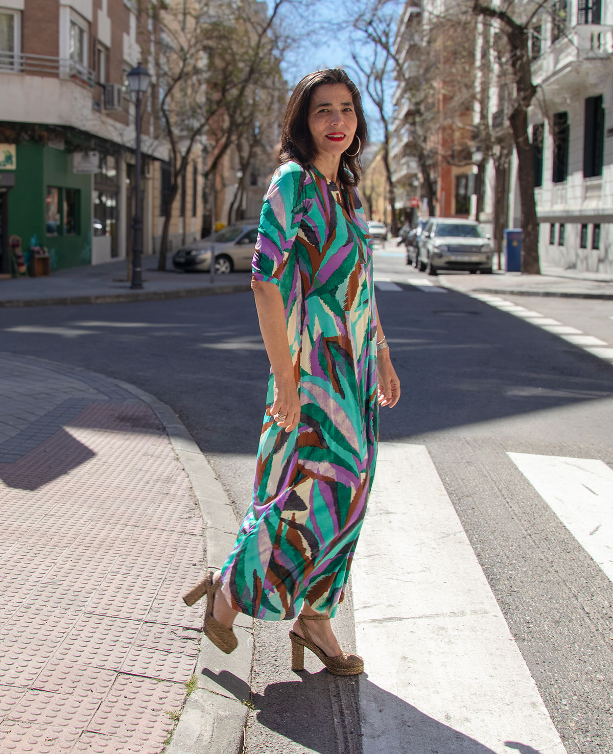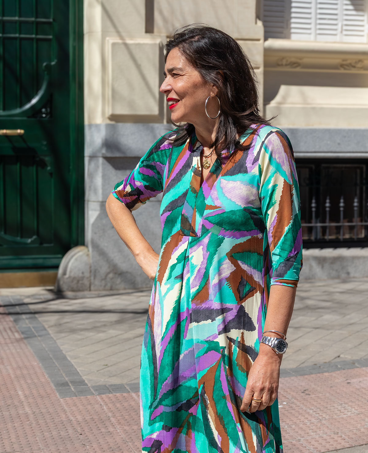 Vestido midi en punto fino con manga francesa, adorno en escote y pliegue delantero. Perfecto para el día a día y ocasiones especiales.