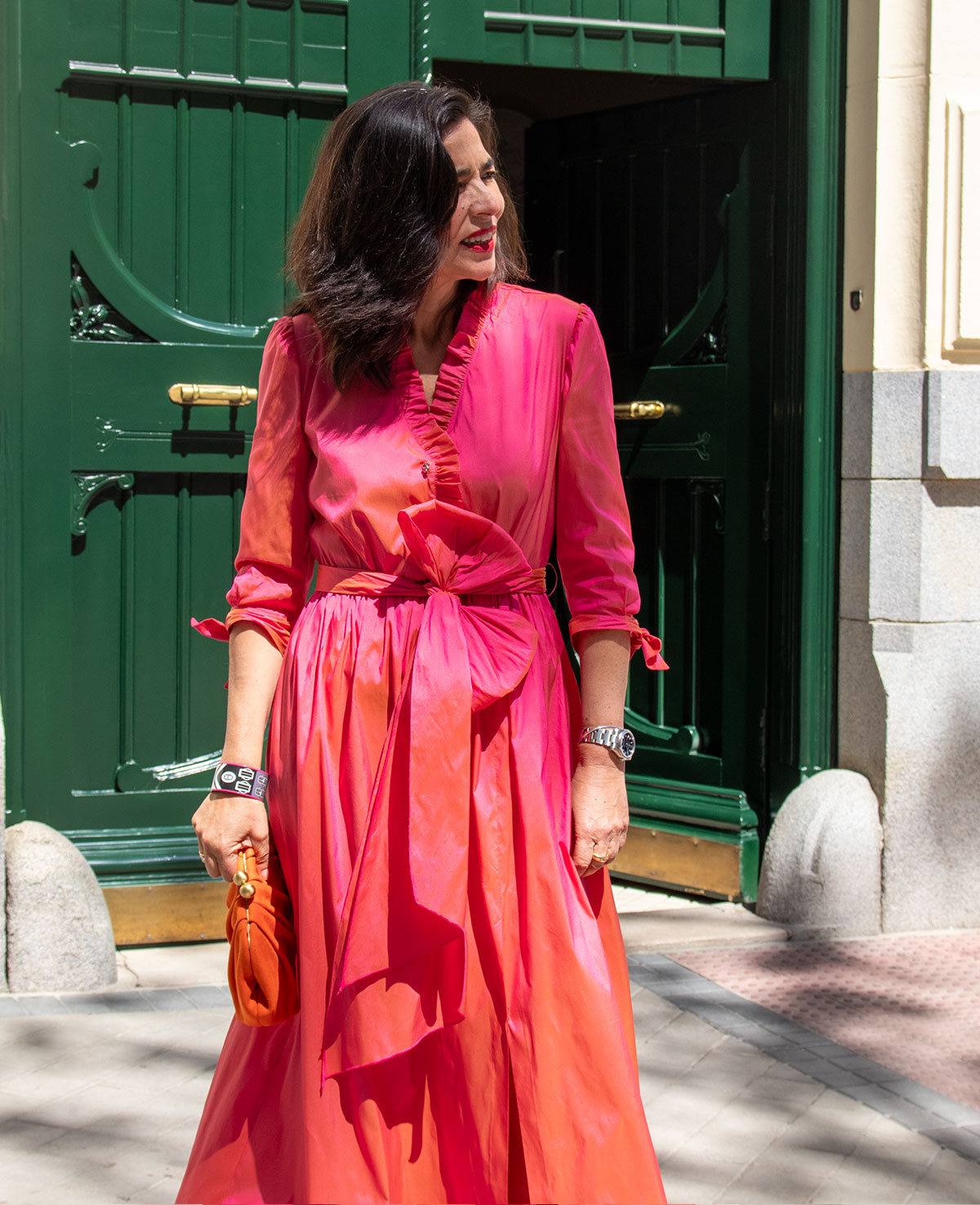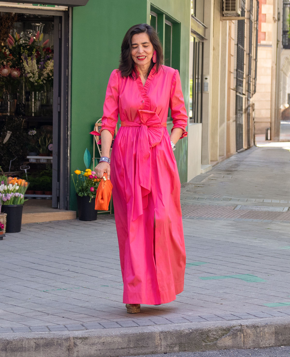 Vestido de fiesta cruzado, escote en pico con adorno de volante, manga francesa, abertura delantera y cinturón con lazada. Perfecto para invitada a boda.