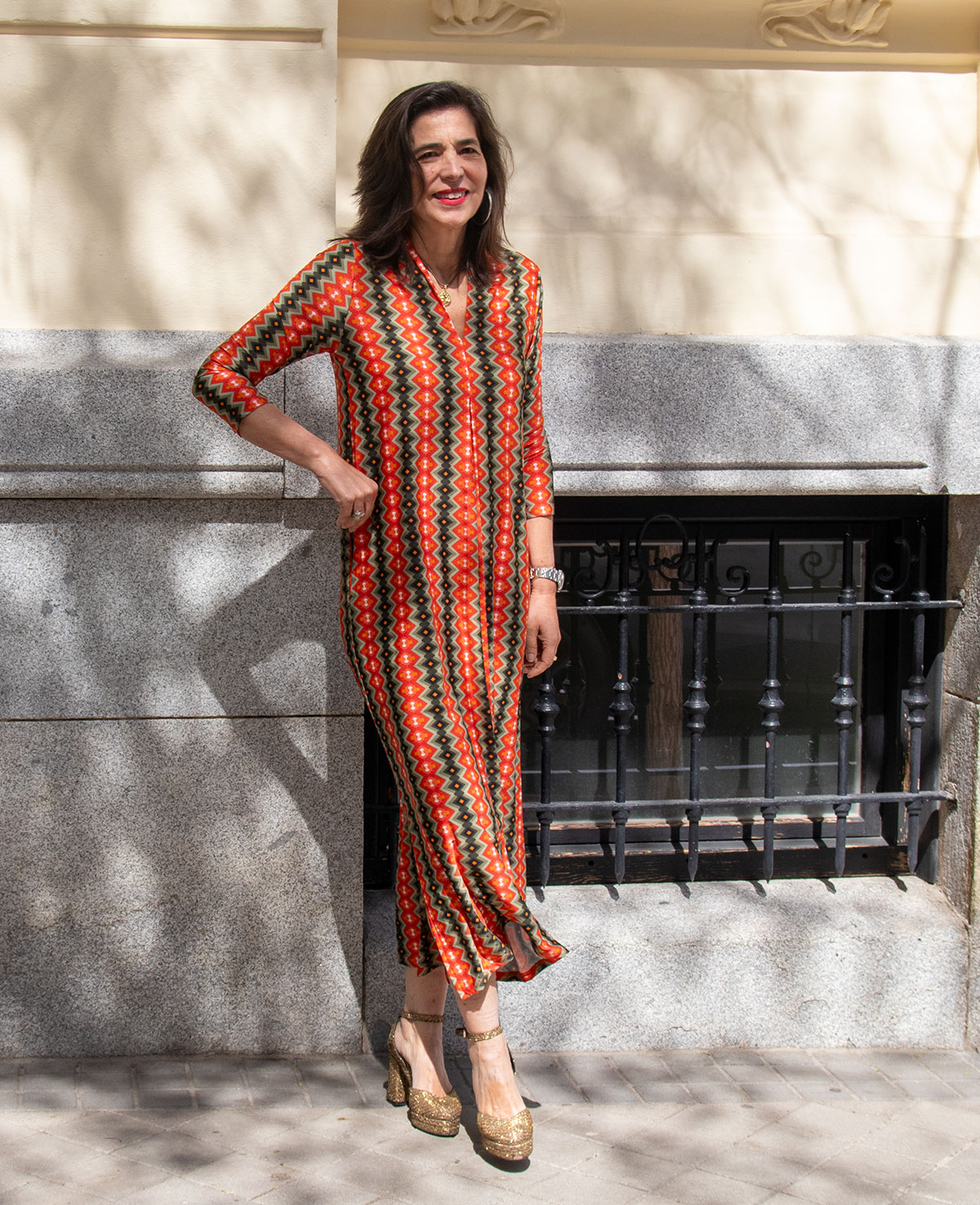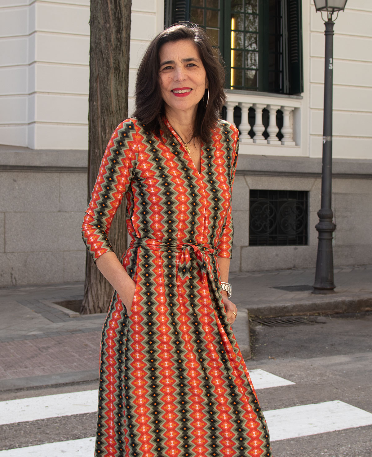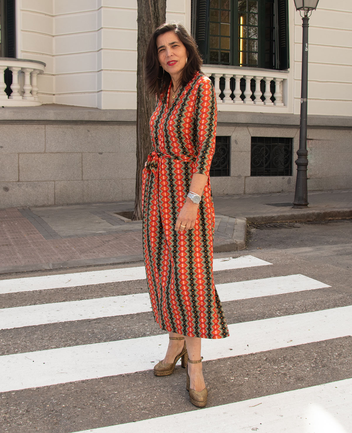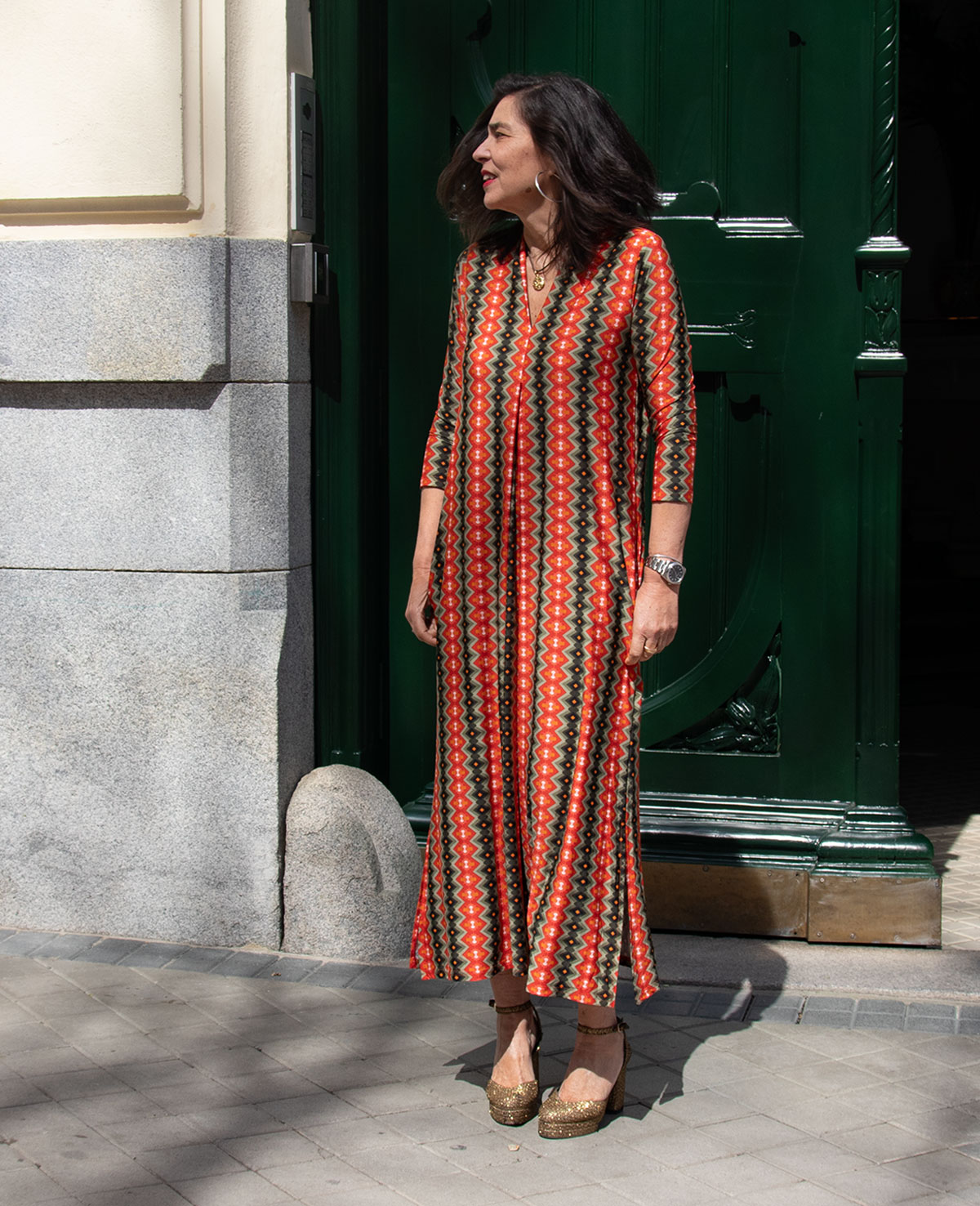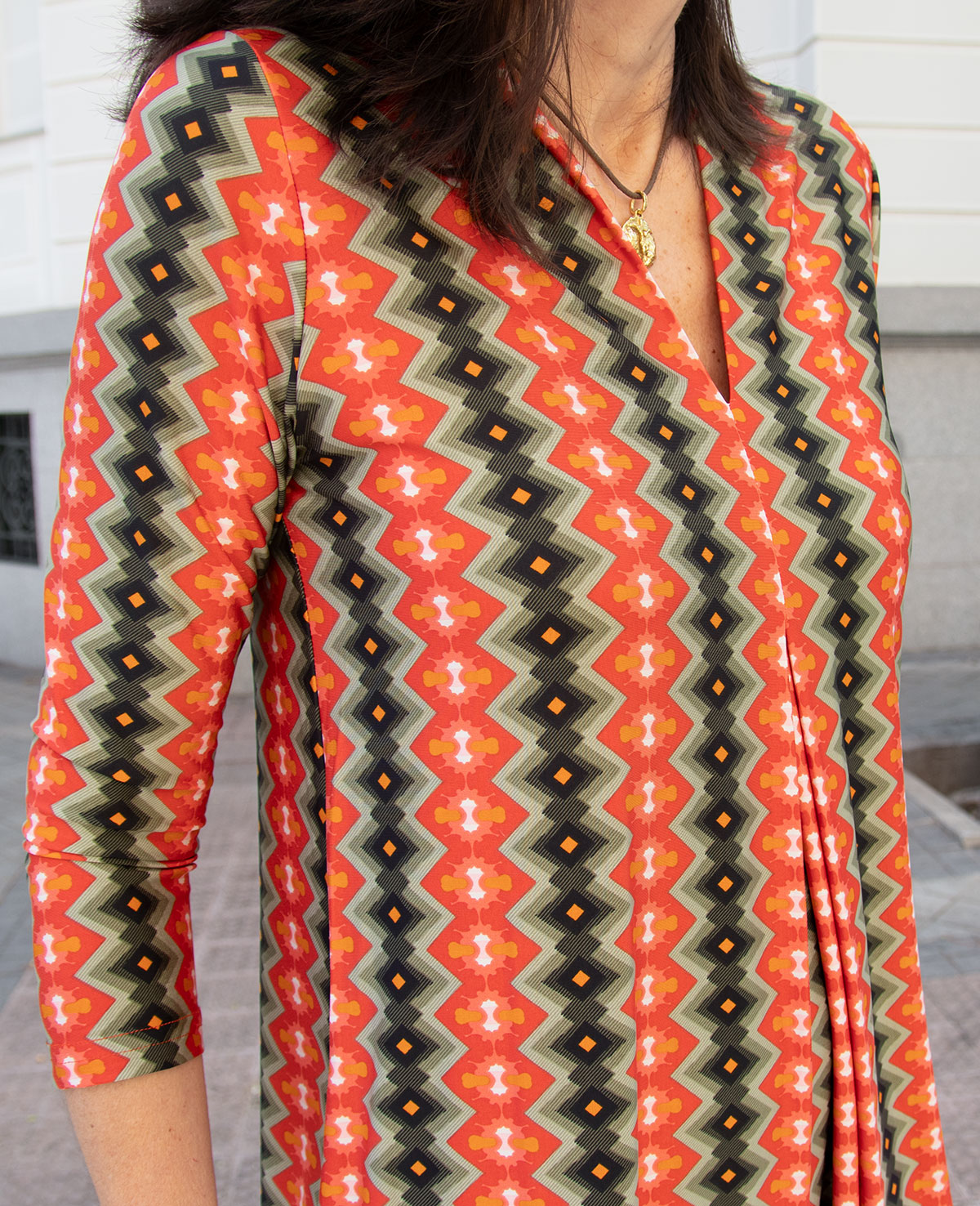 Vestido midi con manga francesa, escote en pico, pliegue delantero, aberturas laterales y cinturón. Ideal para el día y ocasiones especiales.