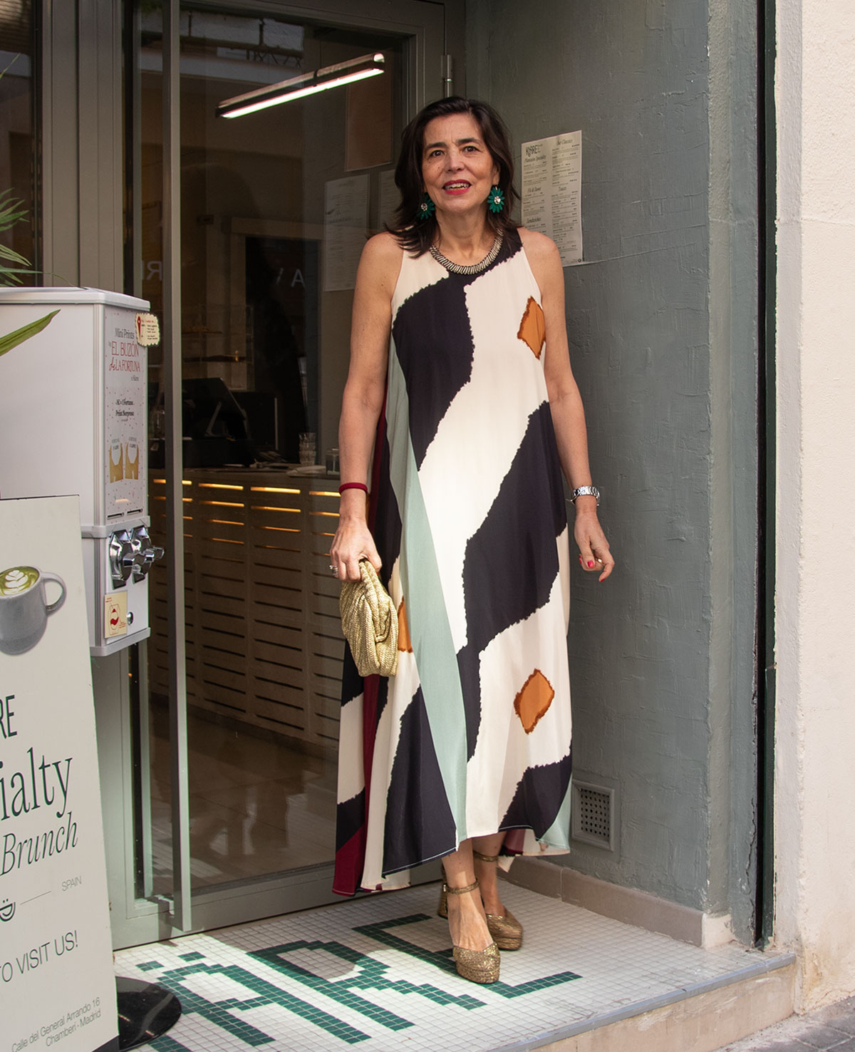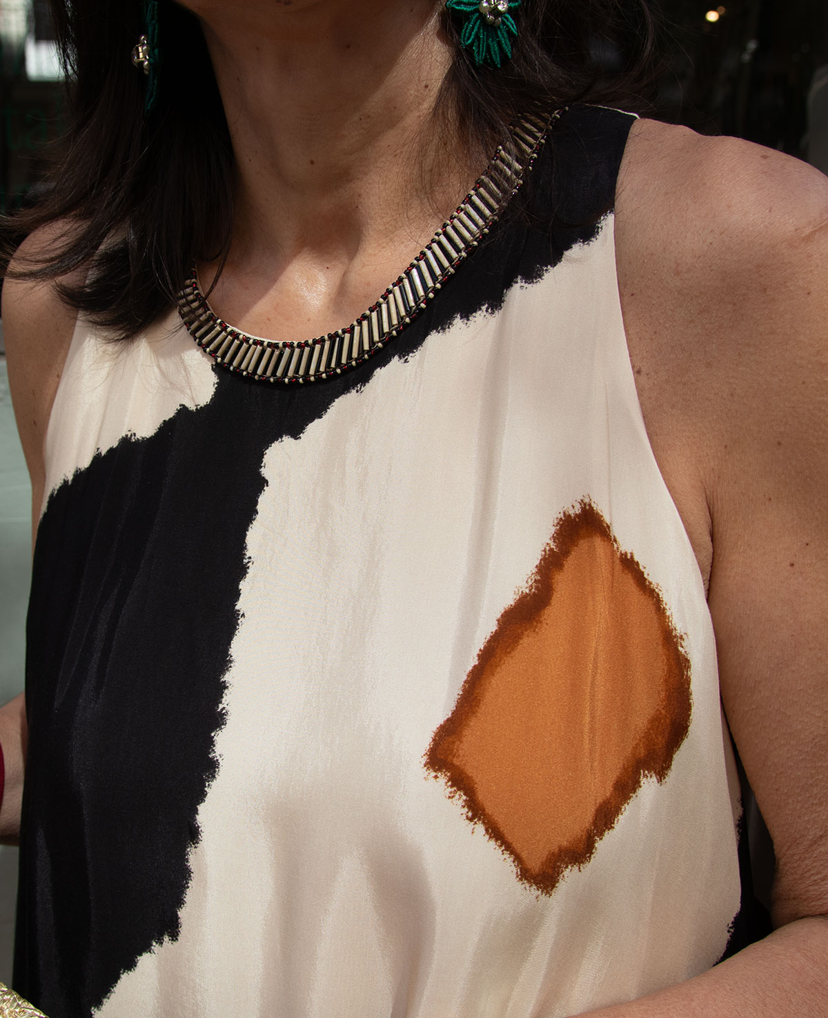 Vestido midi suelto con bajo asimétrico y adorno en el cuello. Ideal para invitada a boda o fiesta.