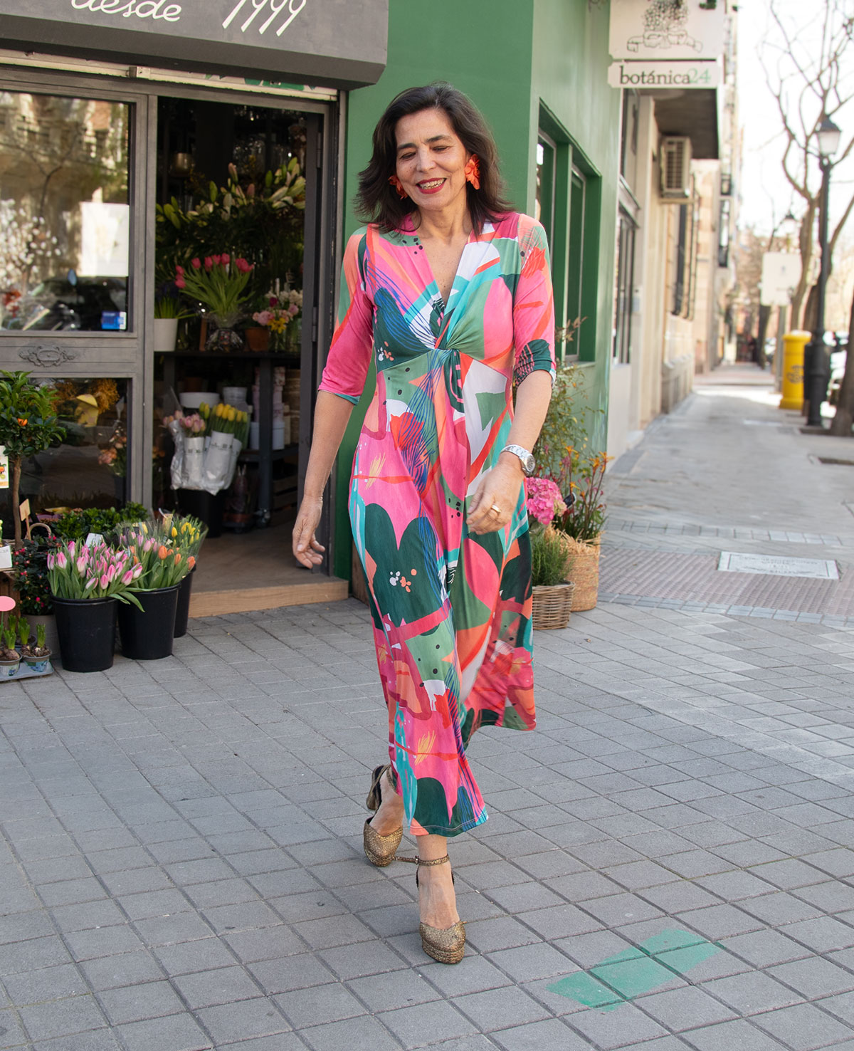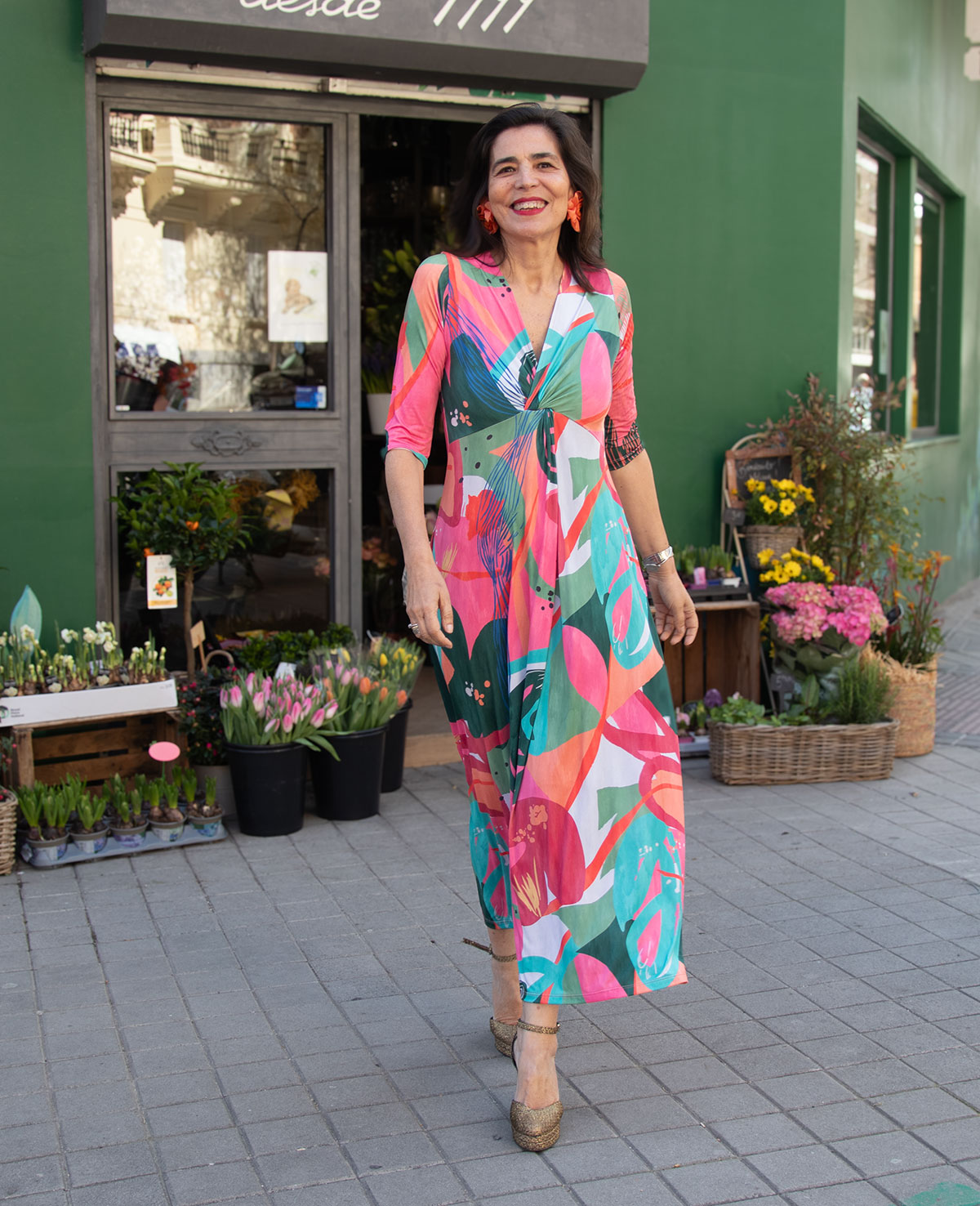 Vestido en punto de seda con manga francesa, escote cruzado en pico y adorno de nudo debajo del pecho. Ideal para invitada y ocasiones especiales.