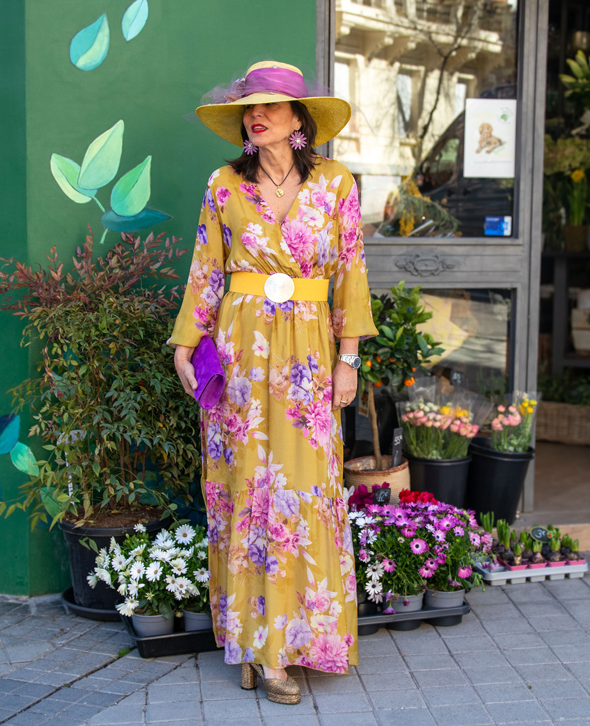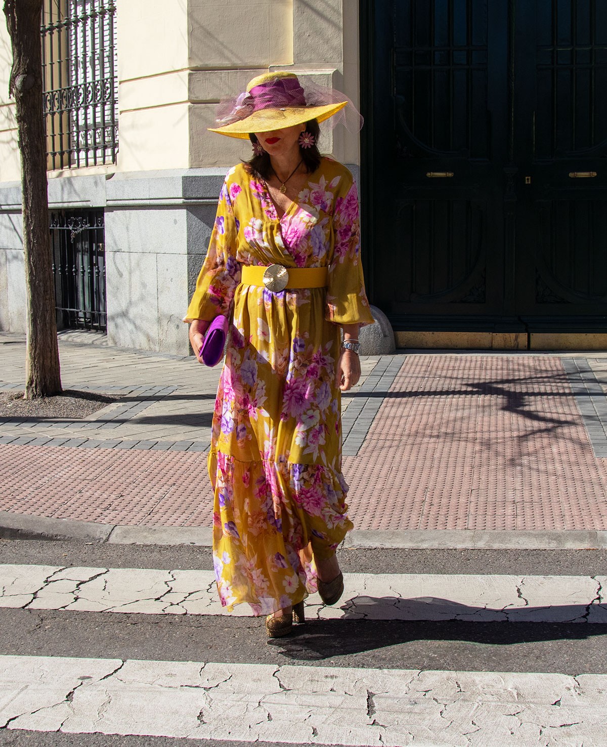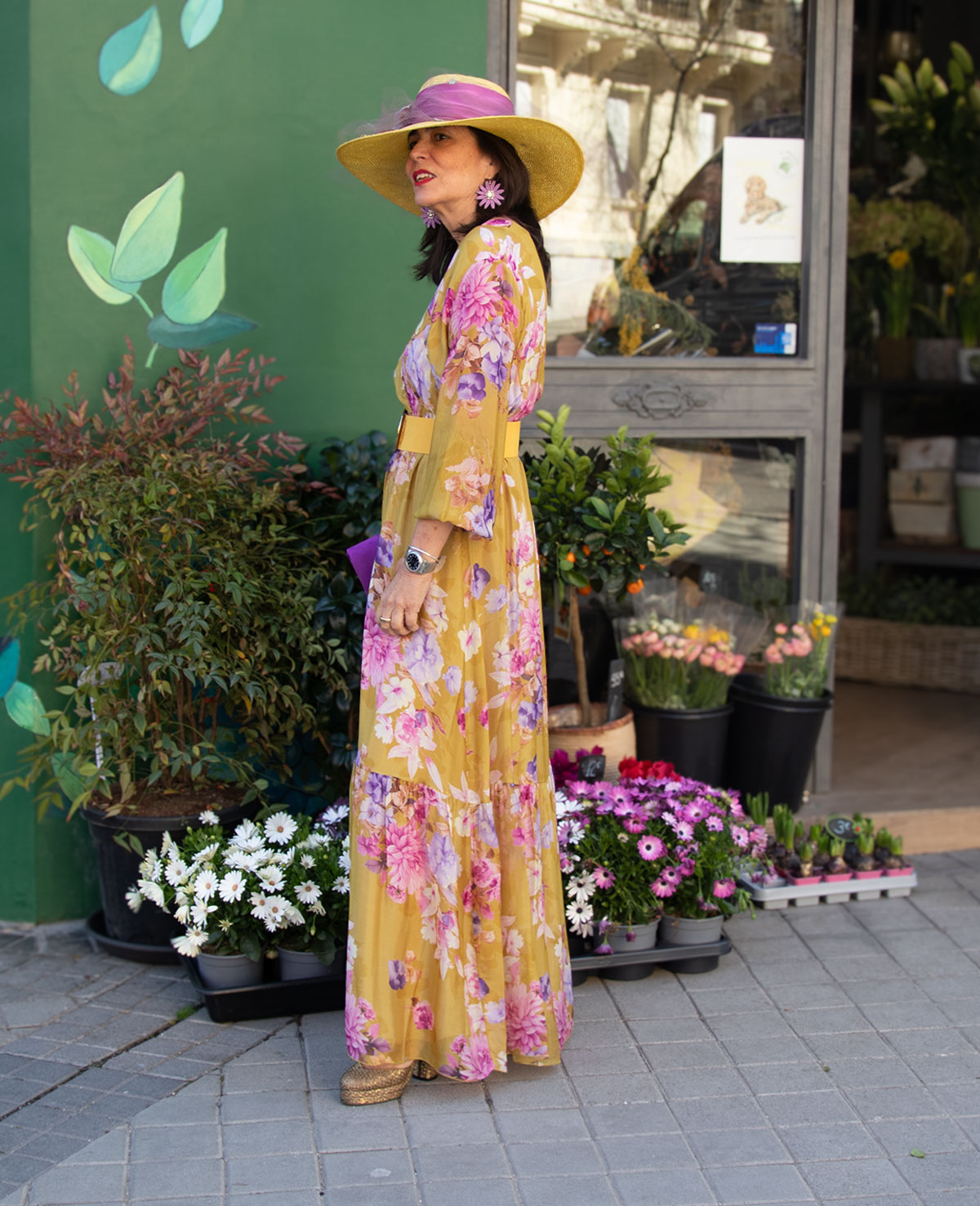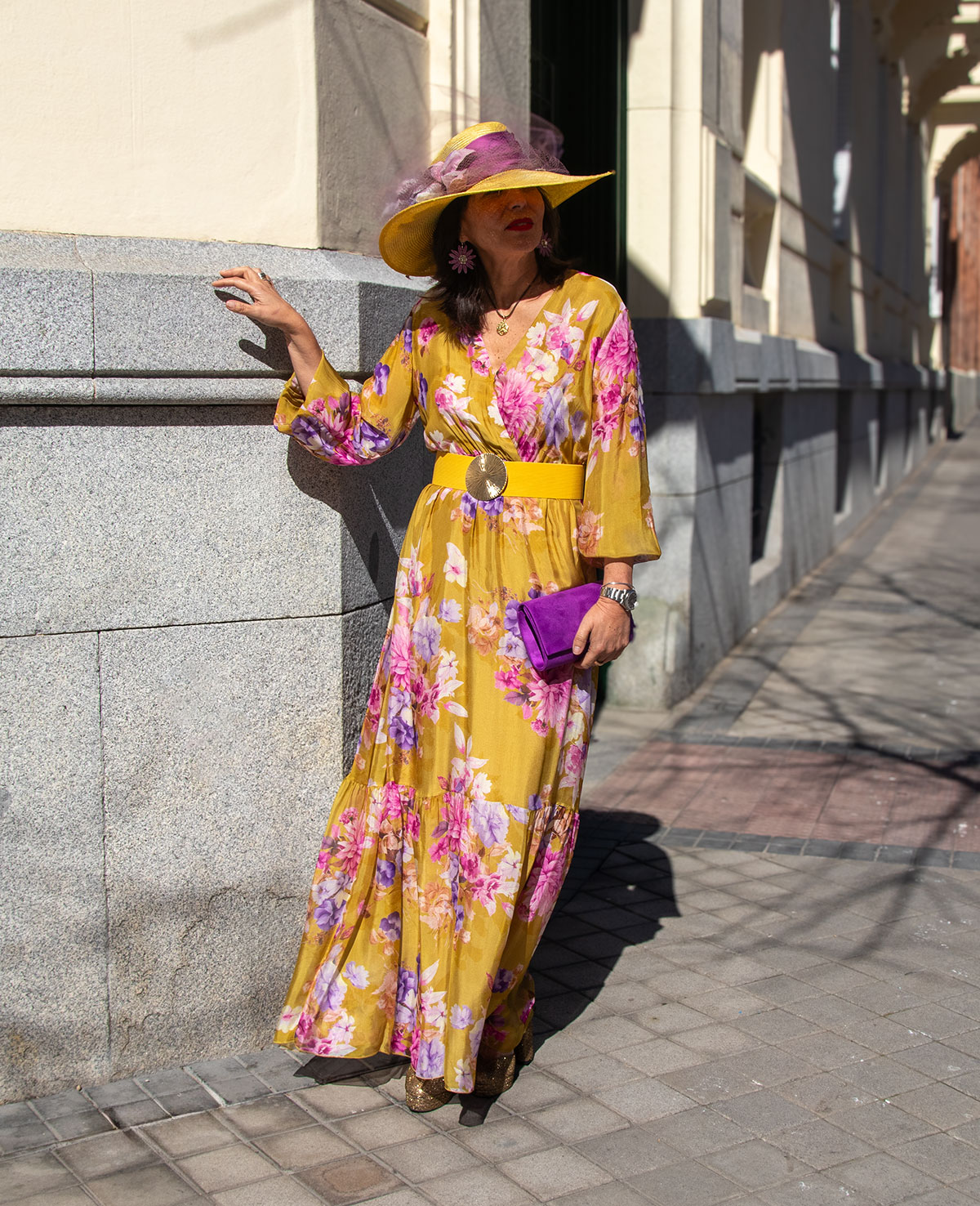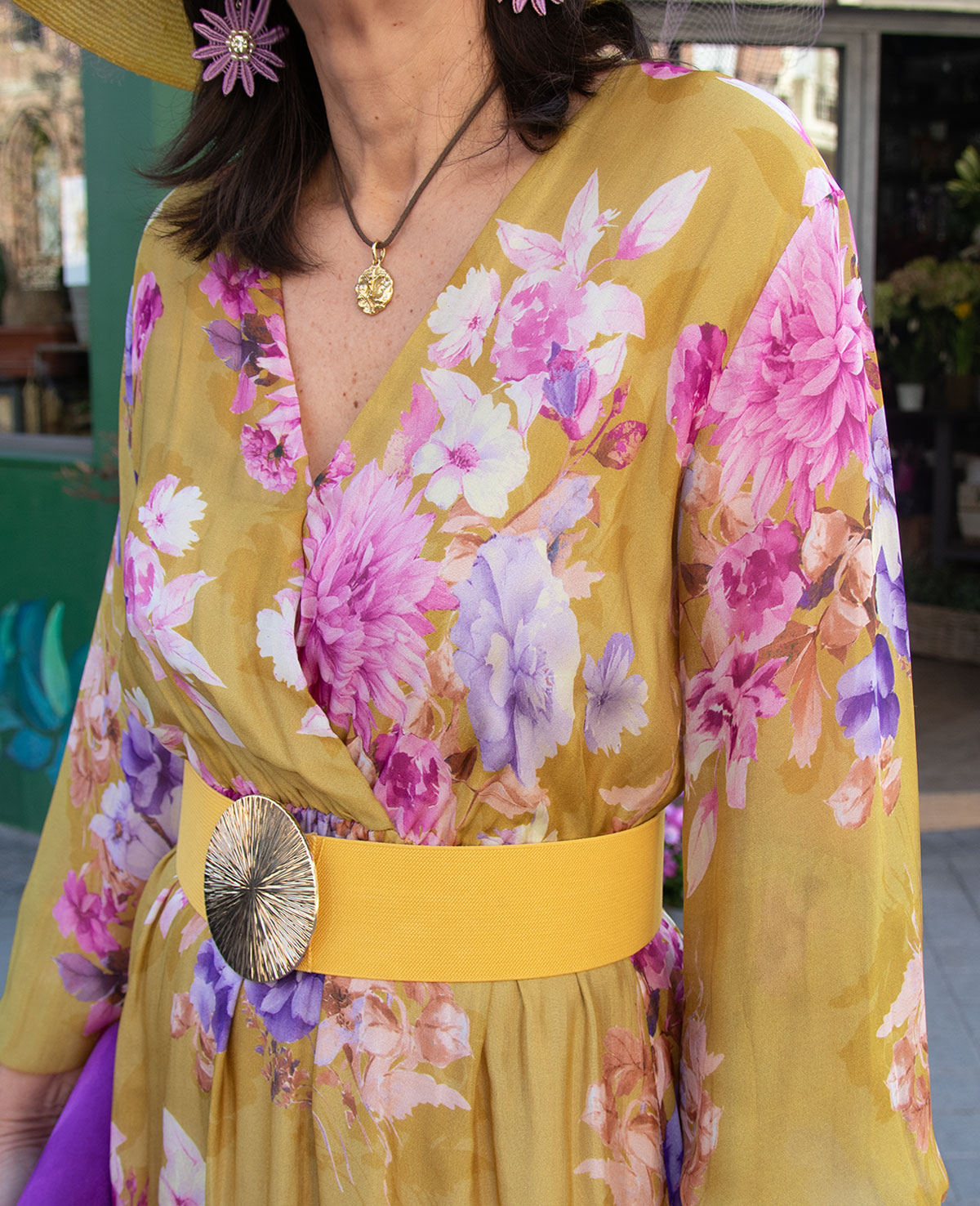 Vestido largo con escote en pico cruzado. corte debajo del pecho, manga con puño elástico y volante. Ideal para invitada a boda de mañana.
