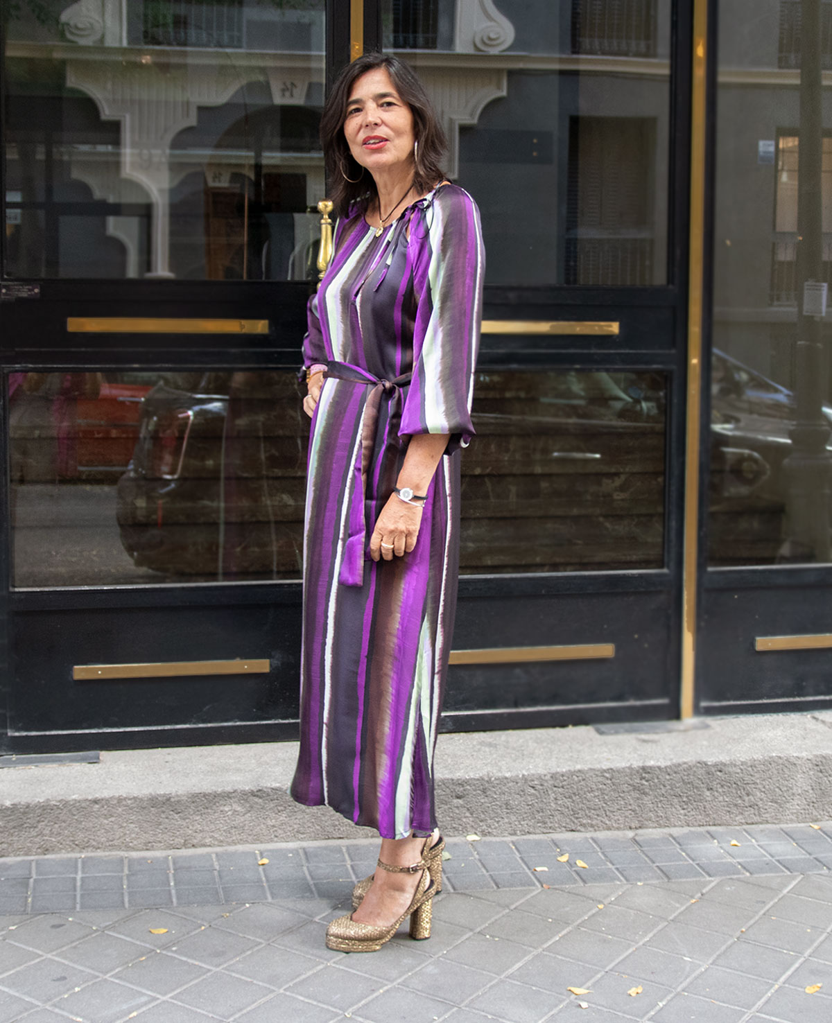 Vestido de fiesta midi satinado. Escote redondo con adorno, manga larga con elástico y cinturón. Perfecto para ocasiones especiales.